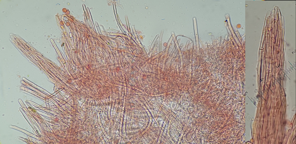 Zystiden tubular, normalerweise unseptiert, apikal abgerundet, deutlich dickwandig (Wanddicke zentral bis 1,5 µm) nur apikal dünnwandig; meistens aus der Stacheltrama entspringend und dort in parallelen Bündeln angeordnet, besonders an den Stachelspitzen büschelig herausstehend, aber auch im Hymenium zahlreich und die Basidien oft überragend;