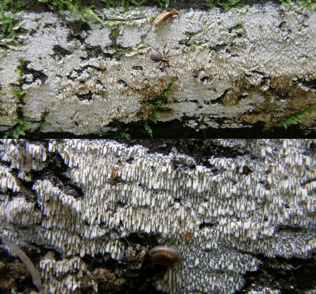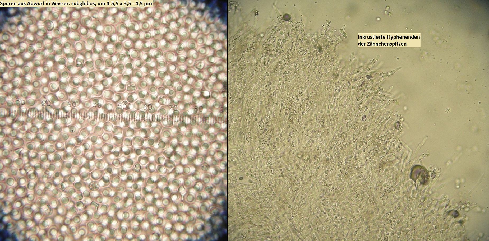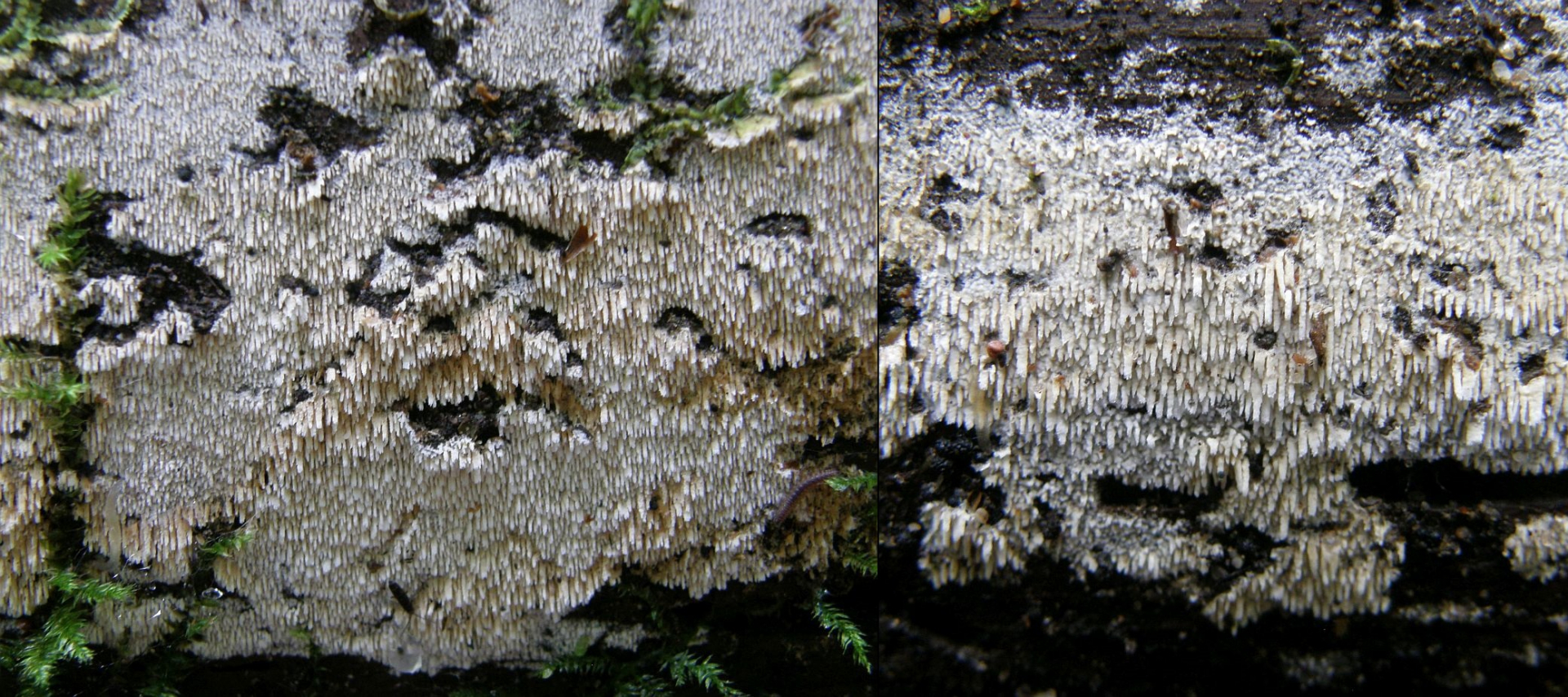 Mal noch eine Kollektion mit etwas ungewöhnlich geformten Zähnchen, wass wohl daran liegt, daß die Fruchtkörper schräg oben auf einem halb in der Streu eingegrabenen, stark zersetzten Laubholzstammstück gebildet wurden.