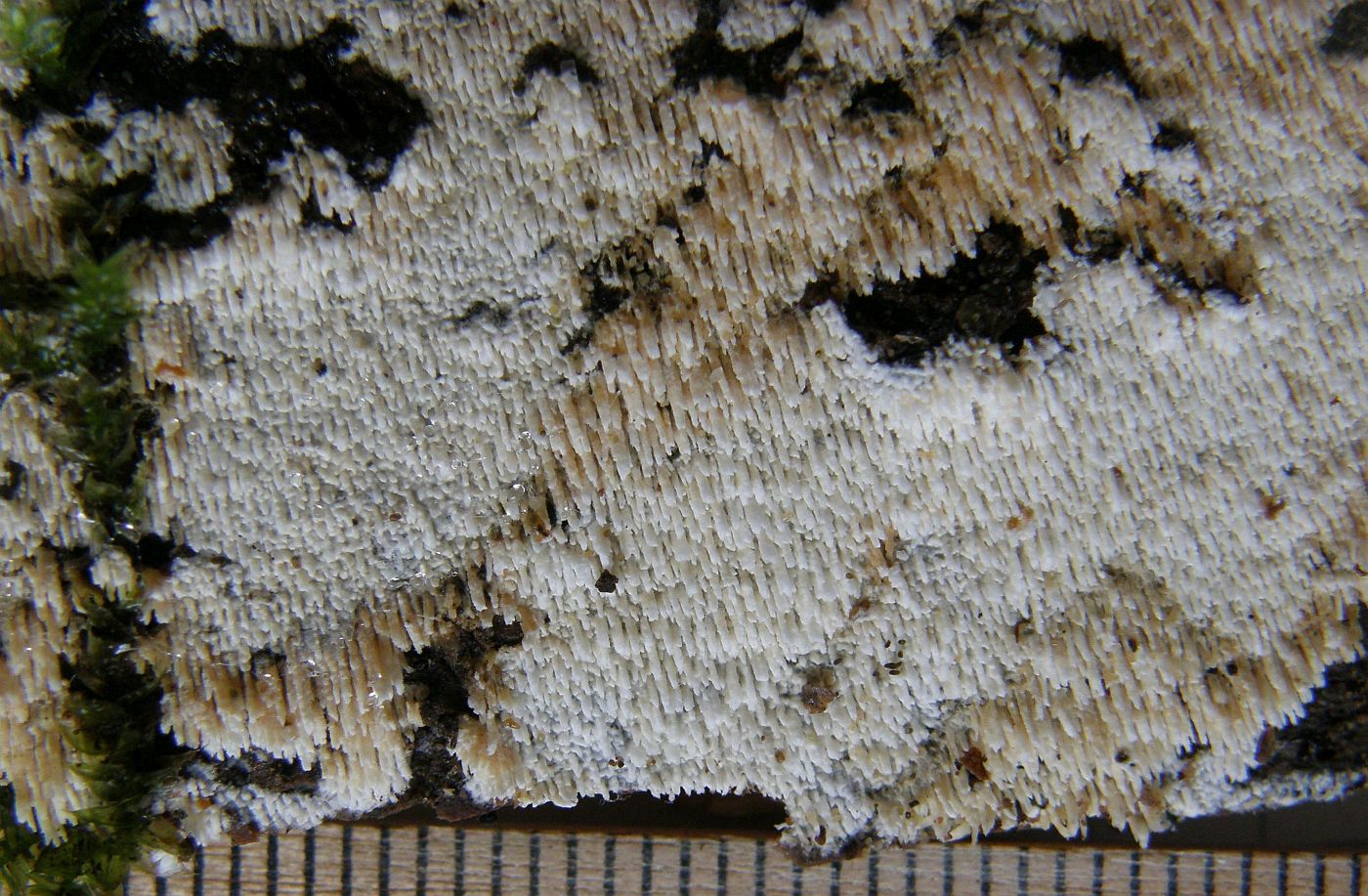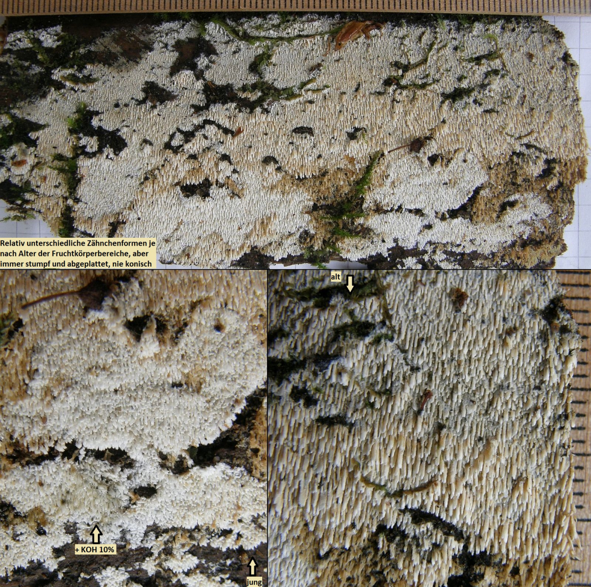 makroskopische Eigenschaften: Fruchtkörper resupinat, ausgebreitet; Hymenophor aus +/- dicht stehenden, bis 4mm langen Zähnchen mit apikal überwiegend abgeflachten Spitzen; weißlich bis cremefarben, höchstens alt und vergehend irgendwie verfärbend; frisch von steif-fibröser Konsistenz, etwas brüchig; Fruchtkörperränder unaufällig ausdünnend bis unauffällig abrupt; zwischen den Zähnchen mit sehr dünnem aber durchgängigem, weißlichem Subikulum