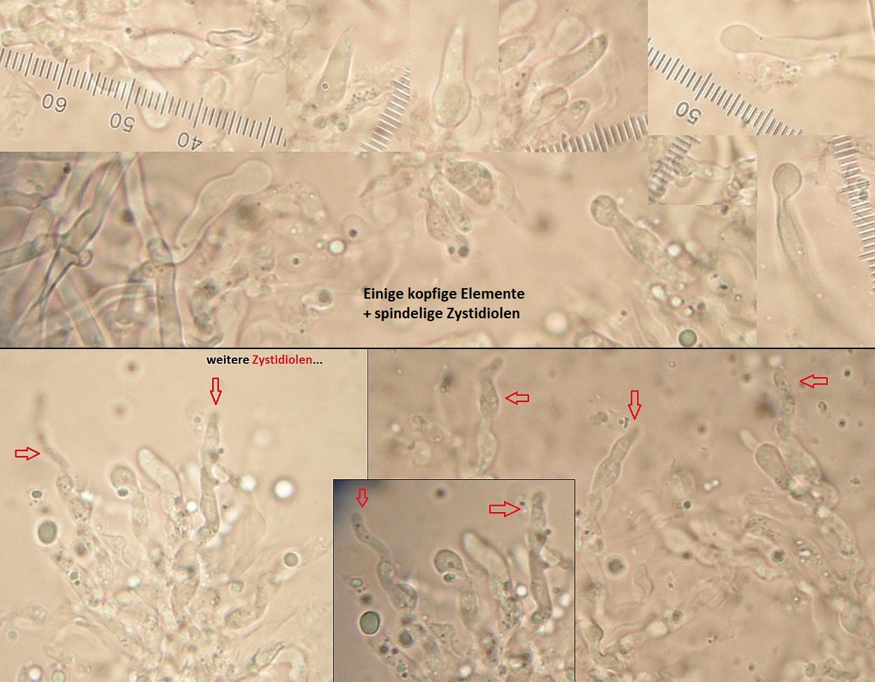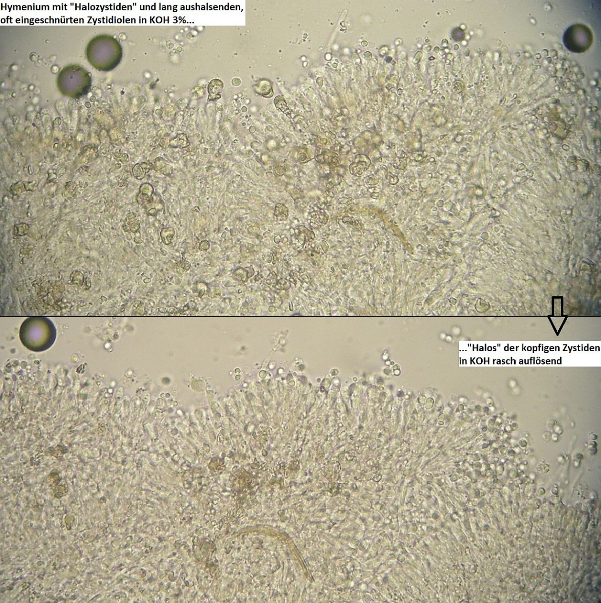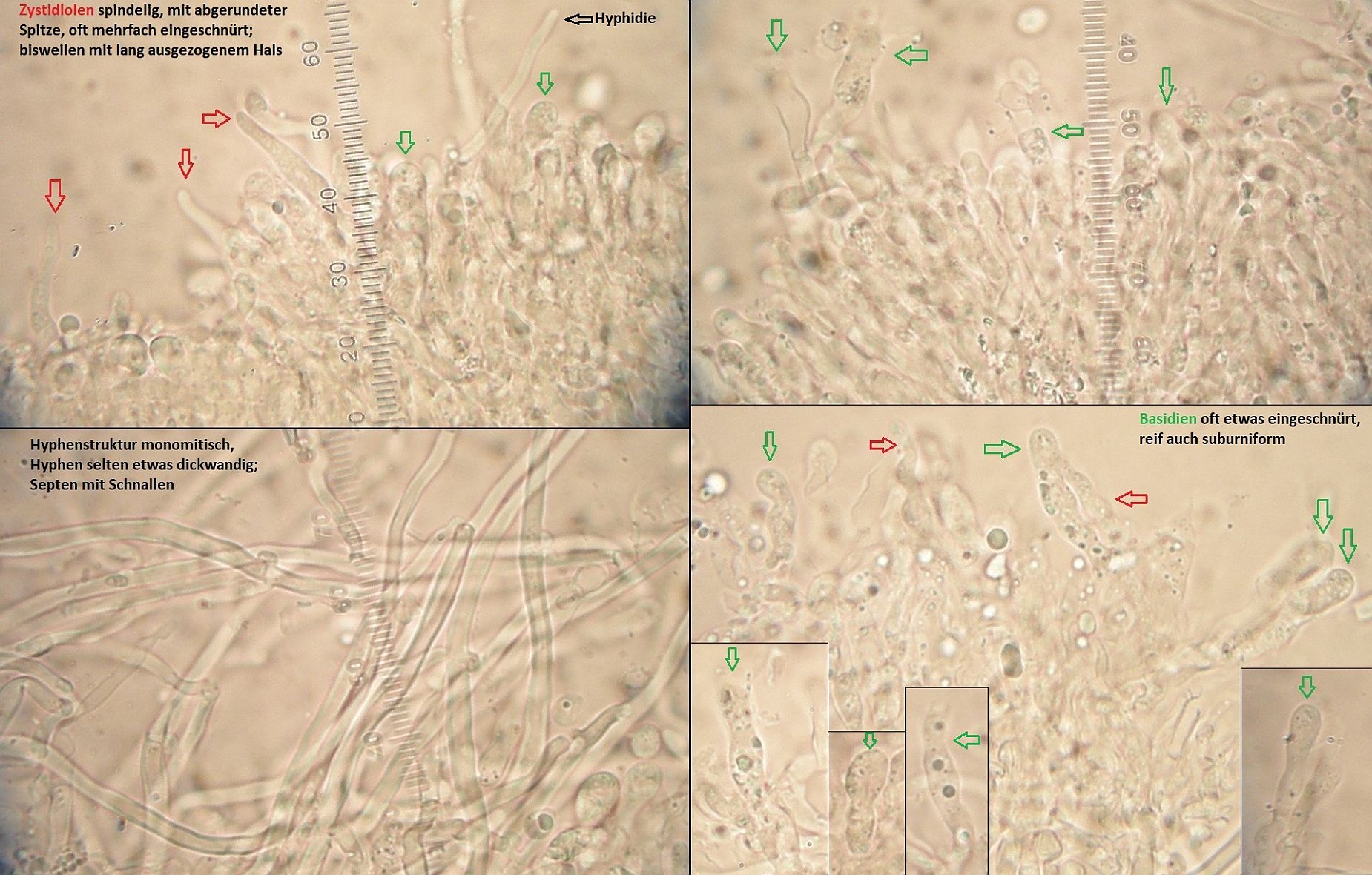 Nach eigenen Beobachtungen sind vor allem die +/- eingeschnürten, zugespitzten Zystidiolen nicht immer konstant und gleichmäßig ausgeprägt, hier gibt es zwischen lang aushalsenden, +/- flaschenförmigen, abgerundet spindeligen und zugespitzten, 1-3-fach leicht eingeschnürten Elementen einige Variationsmöglichkeiten und Übergänge auch innerhalb einzelner Fruchtkörper. An der Form dieser Zystidiolen werden sich daher kaum Arttrennungen orientieren können, wichtig wäre wohl nur, daß überhaupt solche Zystidiolen (oft auch als echte Zystiden interpretiert) vorhanden sind.