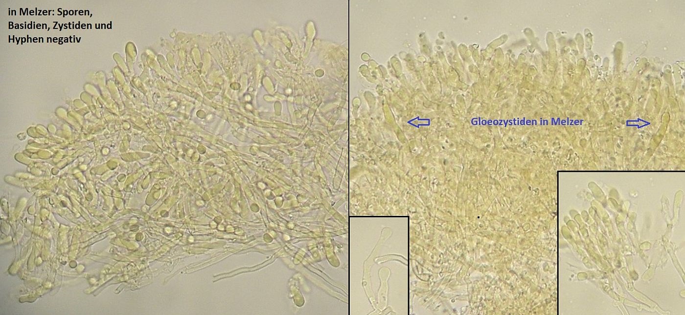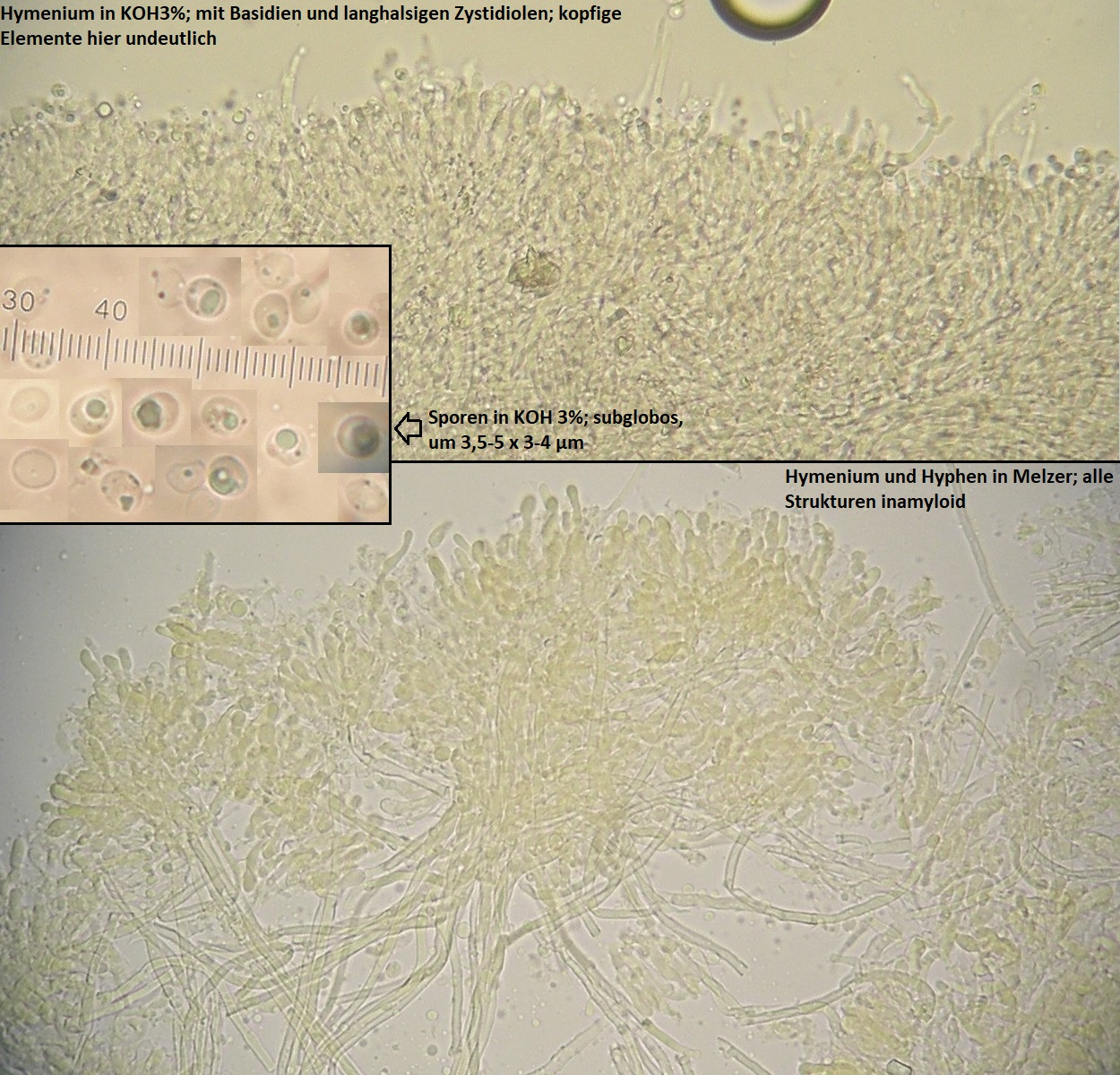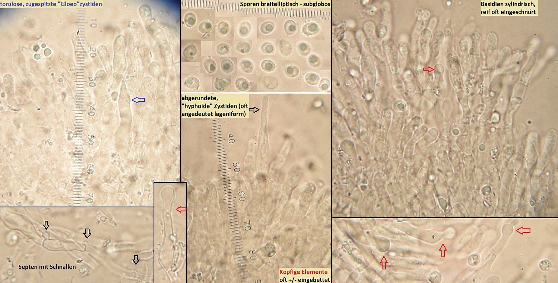 Nach eigenen Beobachtungen sind vor allem die +/- eingeschnürten, zugespitzten Zystidiolen nicht immer konstant und gleichmäßig ausgeprägt, hier gibt es zwischen lang aushalsenden, +/- flaschenförmigen, abgerundet spindeligen und zugespitzten, 1-3-fach leicht eingeschnürten Elementen einige Variationsmöglichkeiten und Übergänge auch innerhalb einzelner Fruchtkörper. An der Form dieser Zystidiolen werden sich daher kaum Arttrennungen orientieren können, wichtig wäre wohl nur, daß überhaupt solche Zystidiolen (oft auch als echte Zystiden interpretiert) vorhanden sind.
