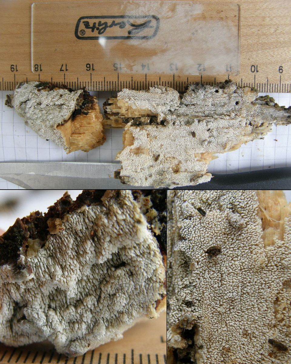 >Xylodon crustosus = Krustenbildender Zähnchenrindenpilz<