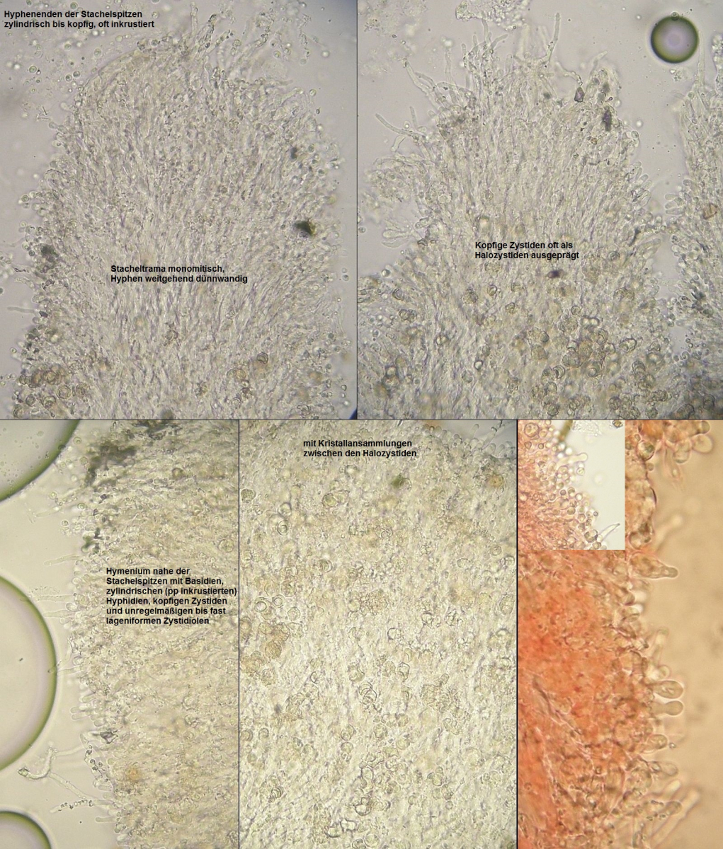mikroskopische Eigenschaften: Hyphenstruktur monomitisch, Hyphen überwiegend dünnwandig, recht dicht verknüpft, in den Stachelspitzen gelegentlich inkrustiert; Septen konstant mit Schnallen; in Stacheltrama, an den sterilen Stachelspitzen und im Subhymenium (seltener ins Hymenium ragend) mit vielen kopfigen Hyphenenden / Zystiden, die bei Frischmaterial in Leitungswasser oft als Halozystiden augeprägt sind (Harzkappen in KOH löslich); im Hymenium und an den sterilen Stachelspitzen mit zylindrischen, spindeligen, bis angedeutet flaschenförmigen Zystidiolen, diese oft ein- bis mehrfach eingeschnürt und apikal häufig zugespitzt; ansonsten ohne weitere Zystiden und ohne dickwandige Elemente in Hymenium und Stachelspitzen; Basidien keulig bis fast urnenförmig, viersporig, mit Basalschnalle; Sporen subglobos (einzelne breitelliptische Ausreißer können vorkommen), dünnwandig, glatt, inamyloid, nicht cyanophil, um 3,5-5,5 x 3-4,5 µm