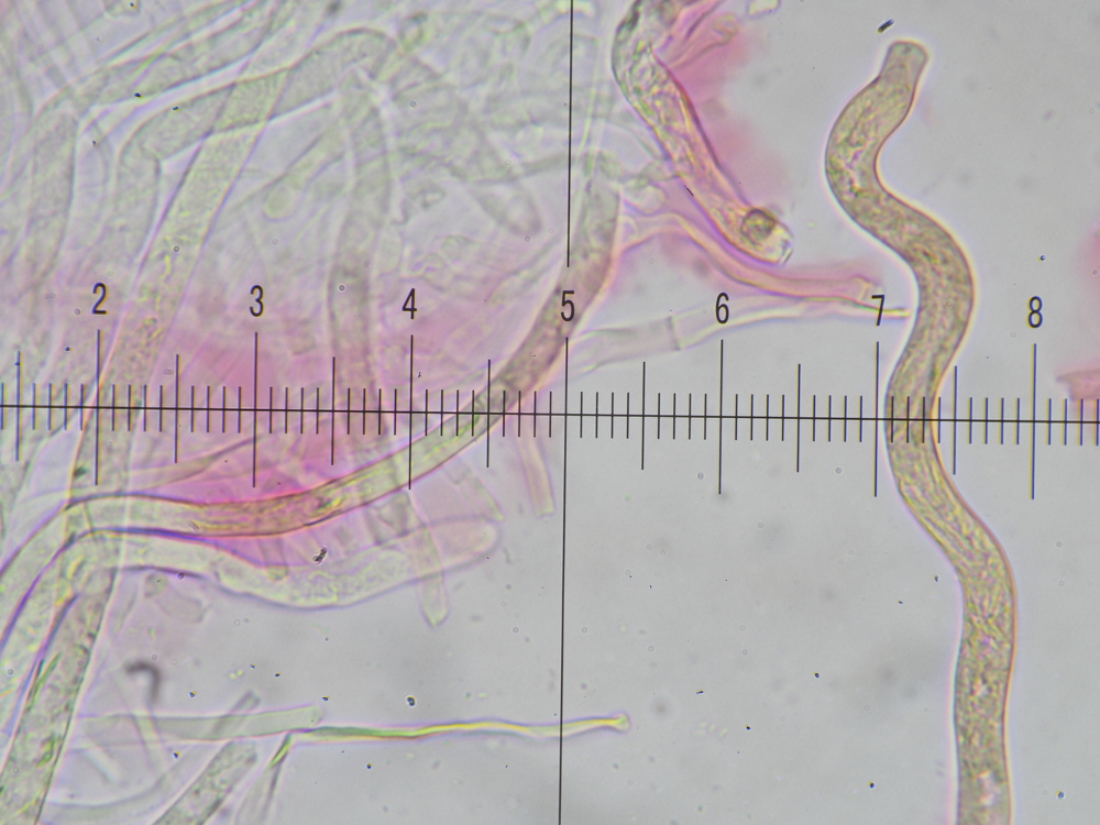HDS: Pileozystiden vorhanden, teils sehr lang, zylindrisch, keulig, mit Ausstülpungen, nicht septiert, bis 9(10) µm breit