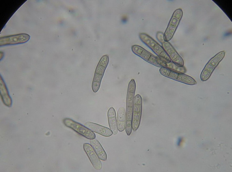 Sporen bis 8x septiert, Endzellen hyalin, leicht gebogen , Mittelzellen braun