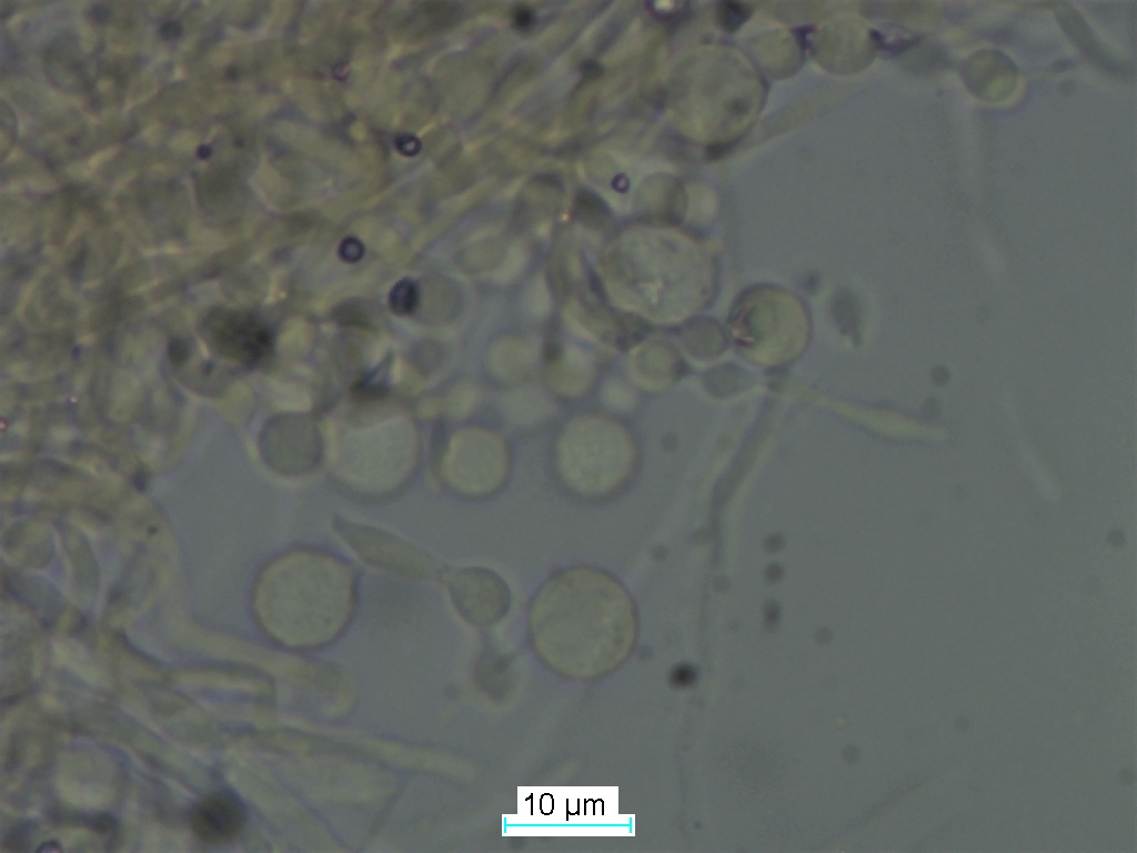wie Karl-Heinz schon geschrieben hat, ist dein Schimmel kein Sepedonium. Karl-Heinz dürfte Sepedonium chrysospermum s.str. zeigen (kugelige Sporen). Es gibt weitere Arten, so einen eigenen auf Rotfußröhrlingen mit ellispoiden Sporen. Sepedonium zeigt dieses wunderschön gelbe, kräftige Ornament. Die großen Sporen keimen zudem nur, wenn sie auf einen passenden Wirt fallen (Boletales mit sehr wenigen Ausnahmen).