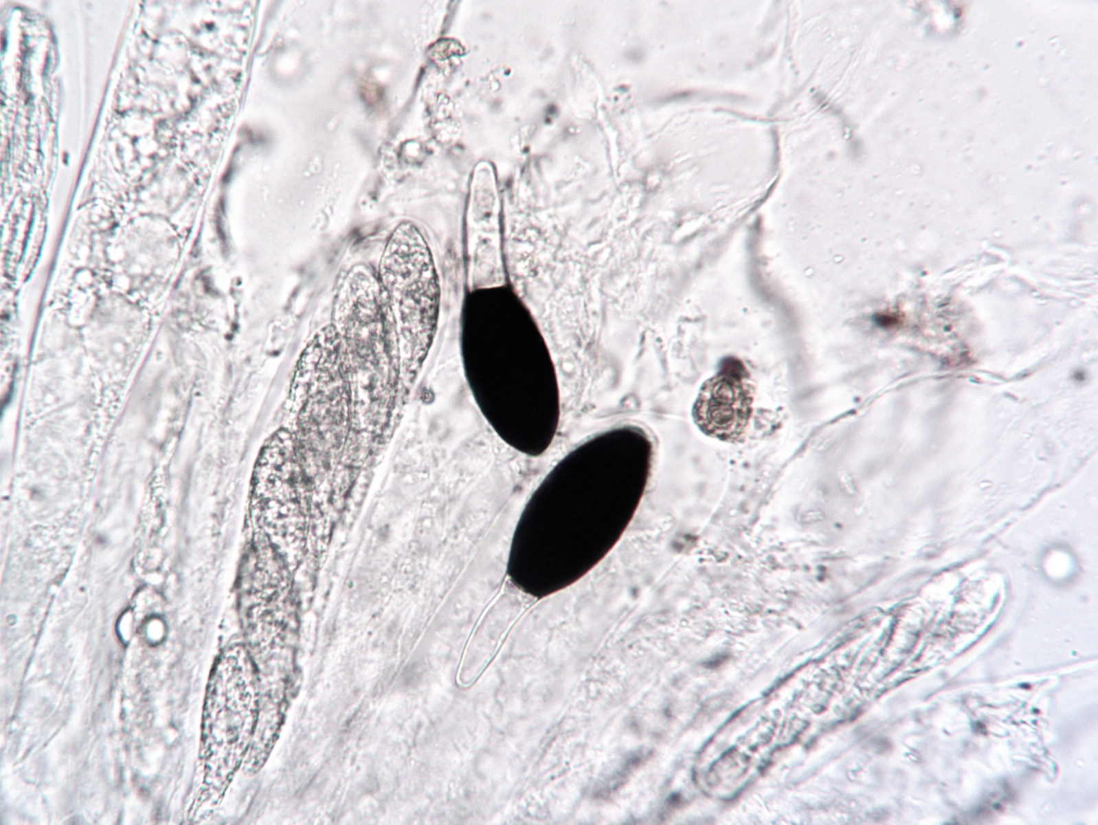 Die Sporen waren nun völlig ausgereift und maßen (40)50-66 x (22)24-29 µm, Pedicel 26-30 x 9-10 µm.