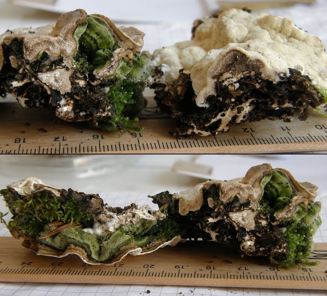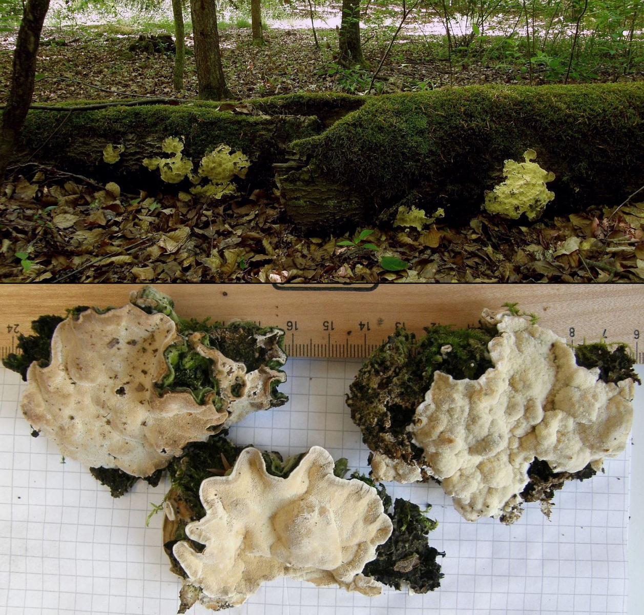 Makroskopisch wäre das aber eine bemerkenswerte Ausprägung. Wobei man berücksichtigen sollte, daß Cerrena unicolor durchaus +/- resupinat wachsen kann, die Farbe des Hymenophors auch durch Witterungsbedingungen beeinträchtigt wurde, und die Form des Hymenophors bei der Art ohnehin einigermaßen variabel ist.