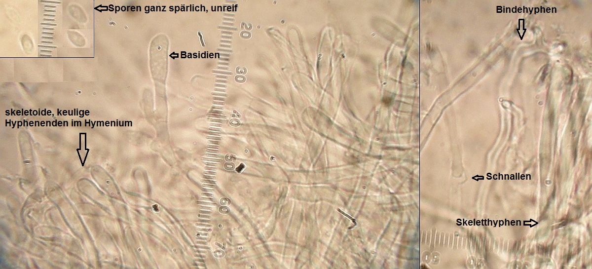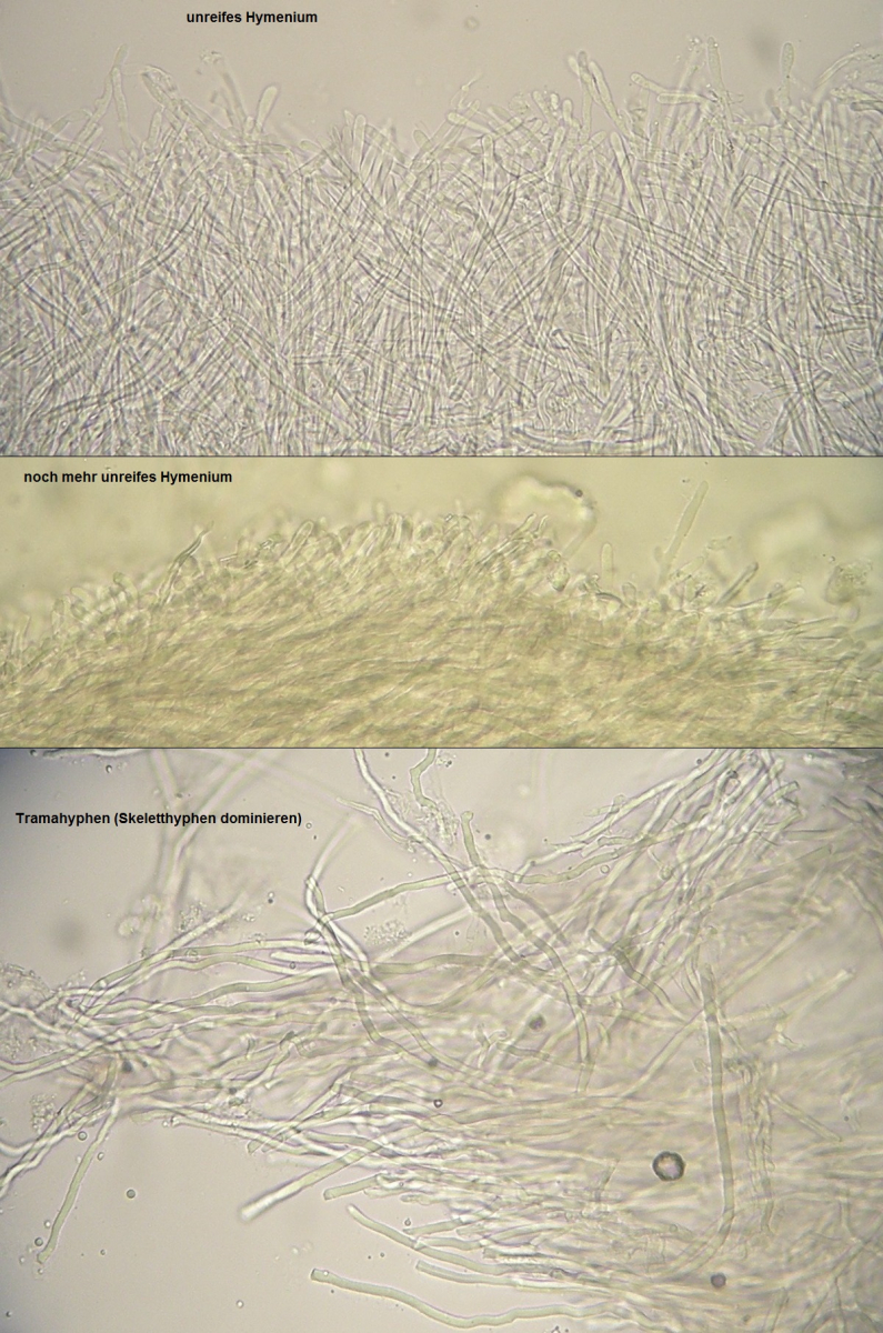 Mikroskopisch erinnert das stark an Cerrena unicolor (Aschgrauer Wirrling), die Sporen etwas zu klein wegen Unreife (Sporenabwurf blieb auch ohne Ergebnis).