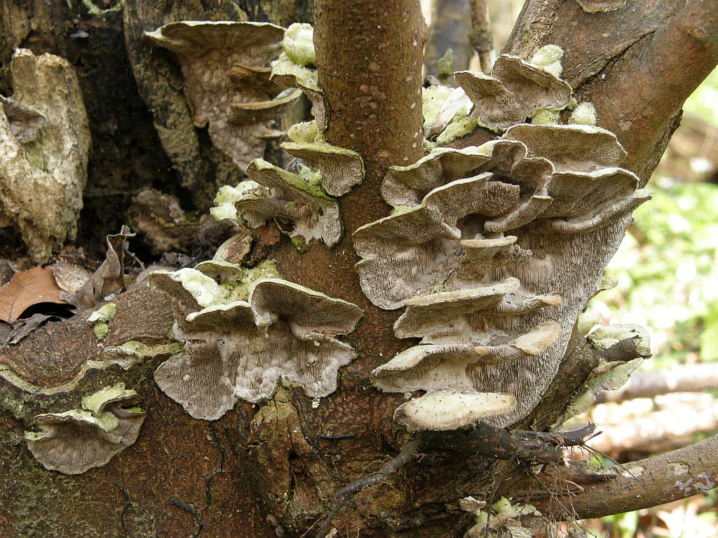 Das wäre nun für mich eine ziemlich unkritische Cerrena unicolor, mit Hutkanten (wenn auch schwach ausgeprägt), normaler Farbe des Hymenophors und "normaler" Porenform. Aber auch da fanden sich Bereiche, wo das Hymenophor in Zähnchen aufbrach und die Form der resupinaten Oberflächen erinnert schon an die oben gezigte Kollektion.