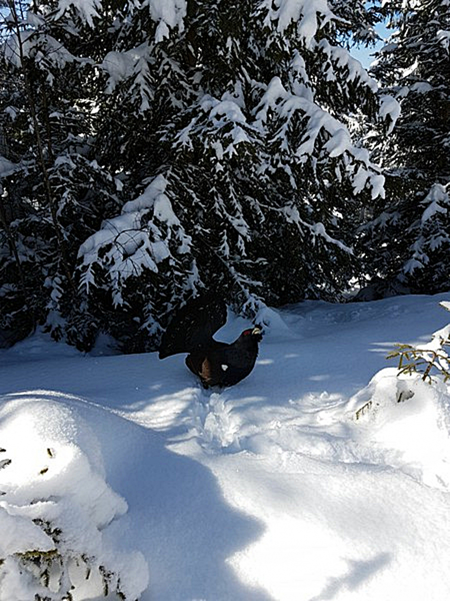 Es war eine überraschende Begegnung. Heute habe ich gegoogelt und das Ergebnis war erstaunlich. Der Hahn ist in der Balz, um diese Jahreszeit! Klar macht er seinen Tanzboden sauber. Aus längst vergangenen Zeiten sind mir die Berichte aus Jägerkreisen in Erinnerung, wie sie sich anschleichen. Der Hahn 'klockt', dann verdreht er die Augen oder so ähnlich. In dieser Phase hört er nichts, dann kommen sie zwei Schritte näher. Das Auerhuhn hat die Ohren offen und zieht sich zurück. So kann man die Population auch beeinflussen, wenn auch nicht gewollt.