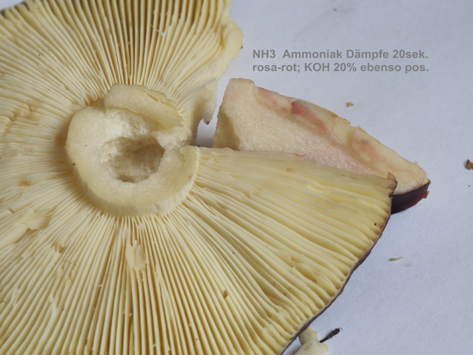 5) Geruch fruchtig, Geschmack brennend-scharf!!! Lamellen gelblich und mit NH3 Dämpfen rosa-rot, mit KOH 20% violett-rot
