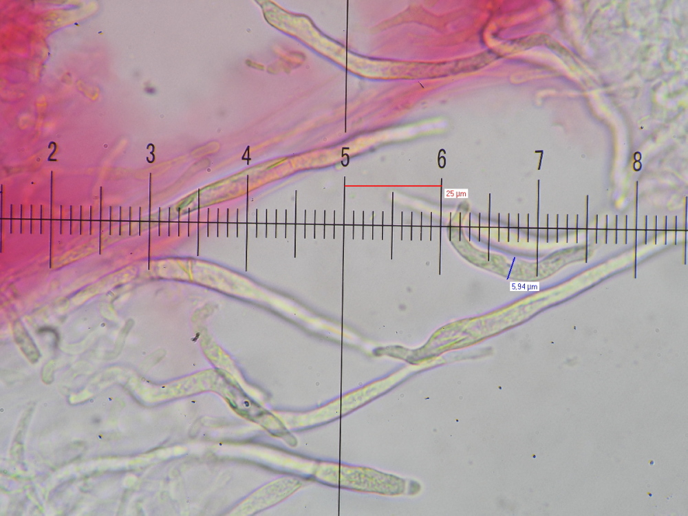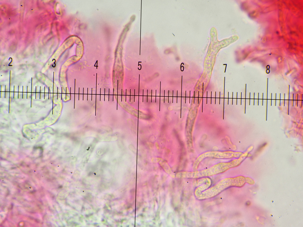 HDS: Pileozystiden vorhanden, zylindrisch, spindelig, kopfig, gabelig, Divertikel, um 6 µm breit