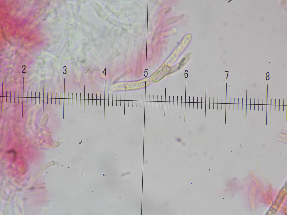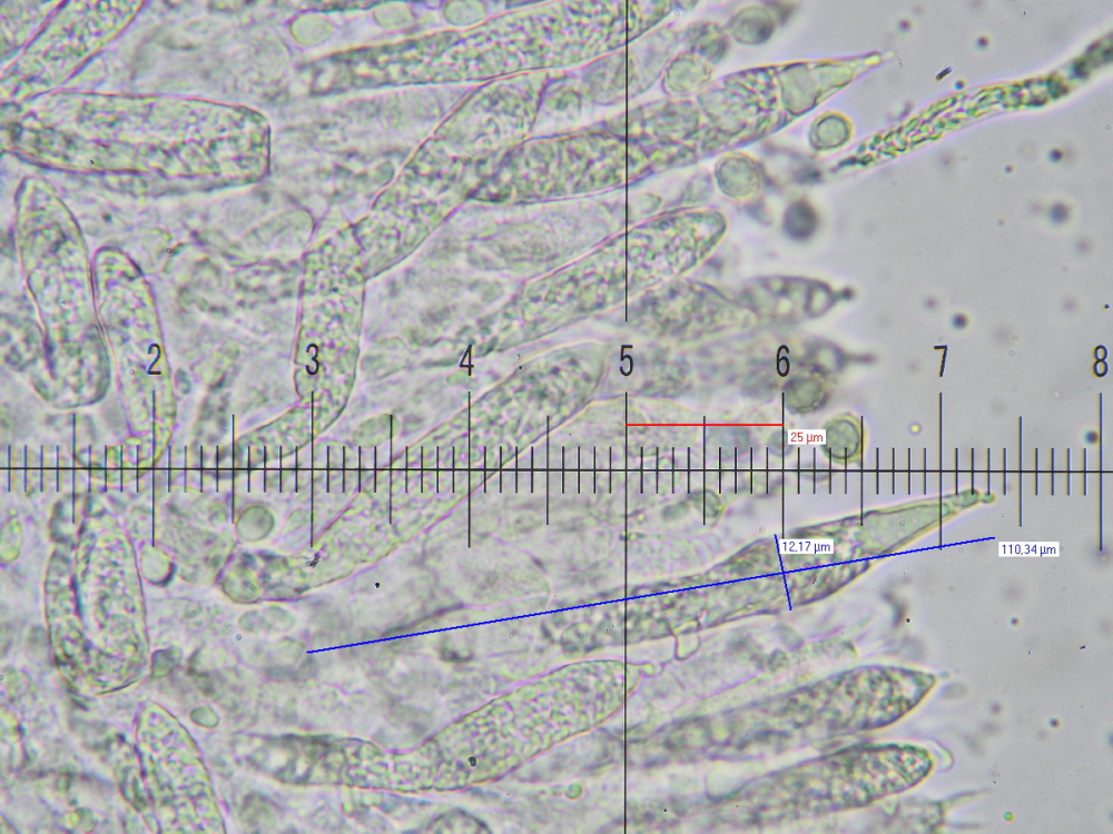 Sonst: Pleurozystiden mächtig, kopfig bis zuspitzend, 110+ x 12 µm, Cheilos ähnlich, 80 x 8 µm