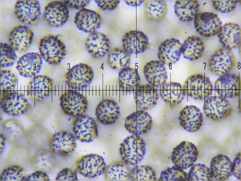 SPOREN: Sporen[95% –• 122 –• SAP –• v –• H2O(nat) ] = (6,5)6,6 - 7,6 - 8,5(8,7) x (5,7)5,8 - 6,5 - 7,2(7,4) µm