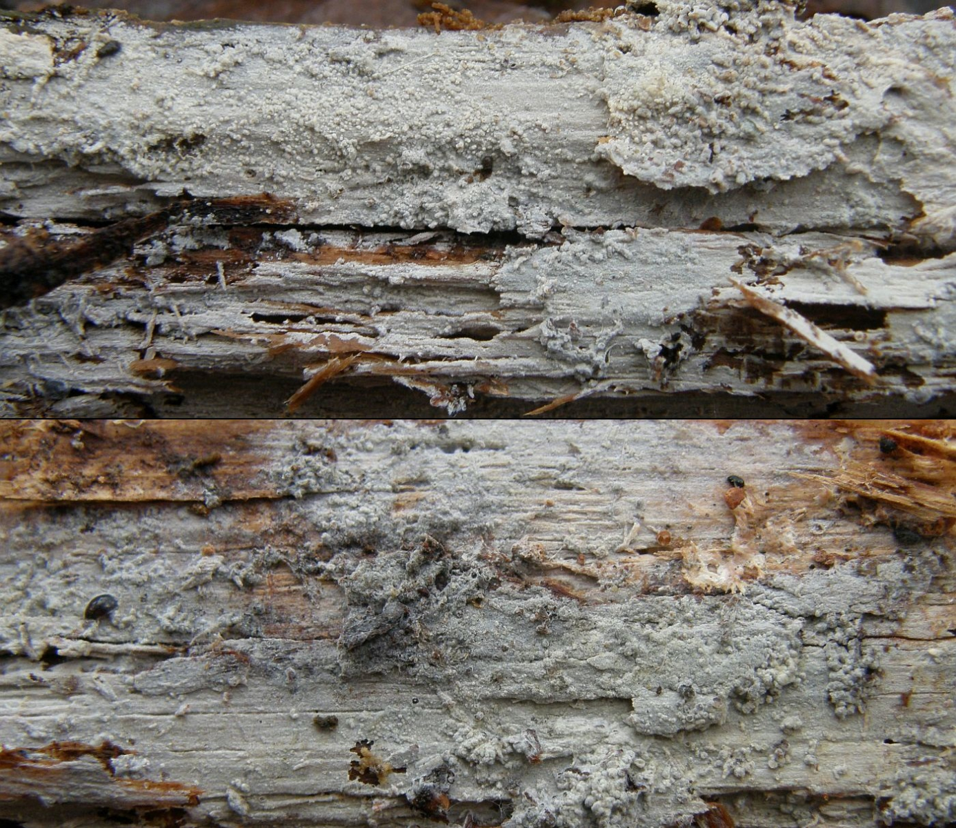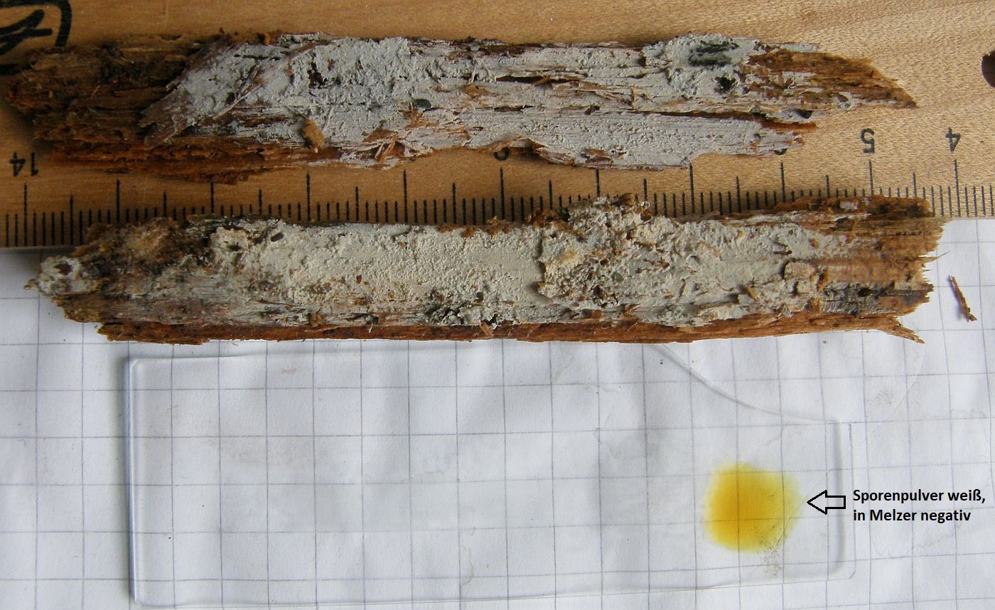 makroskopische Eigenschaften: Fruchtkörper dünn, fein gewebeartig oder krustenförmig bis lose häutchenartig, bestenfalls in Fitzelchen vom Substrat zu lösen; Oberfläche glatt bis sehr fein körnig (gröbere Warzen sind normalerweise nur Strukturen der überwachsenen Unterlage); anfangs weiß, cremeweißlich, spät erst mit ockerlichen Verfärbungen (wenn überhaupt); Ränder unauffällig, ohne Wimpern oder Rhizomorphen