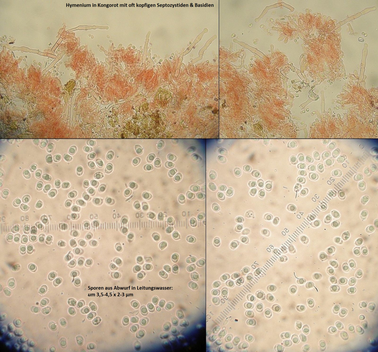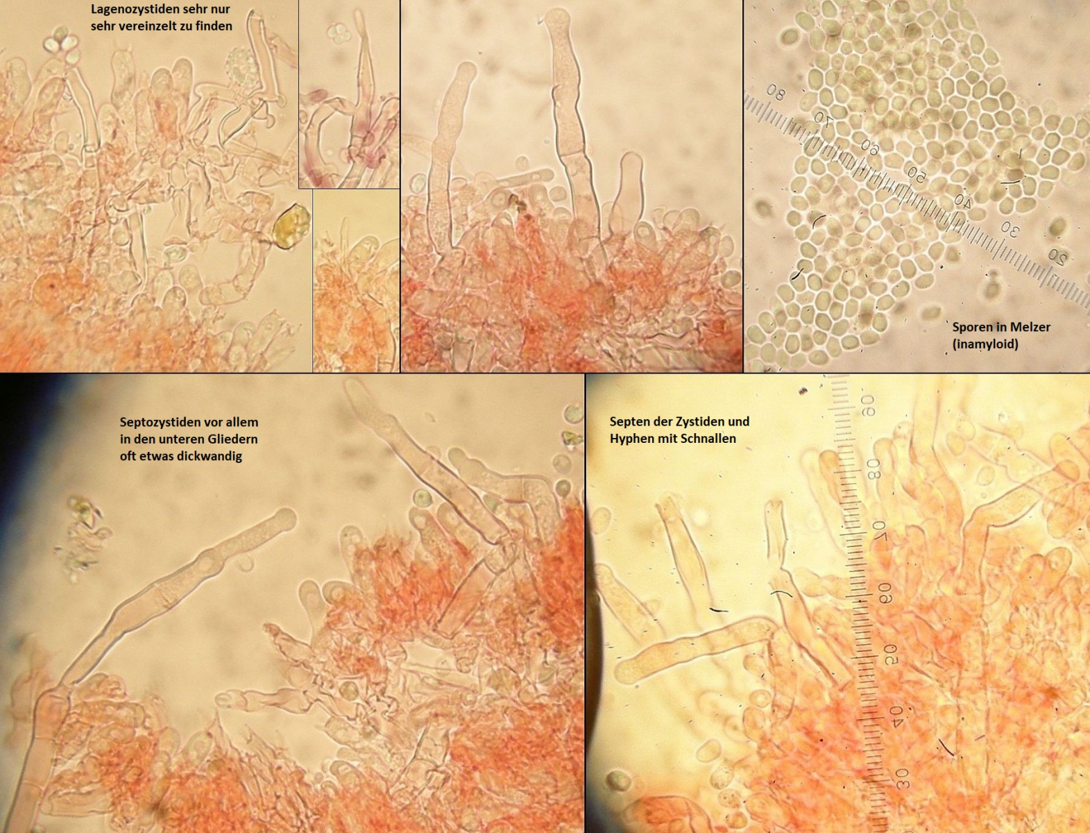 mikroskopische Eigenschaften: Hyphenstruktur monomitisch, Hyphen vorwiegend dünnwandig, nur an den Septozystiden gelegentlich mit verdickten Wänden; Basidien zylindrisch & oft etwas eingeschnürt, Basidiolen auch keulig; Zystiden meist +/- kopfig; septiert, mit verdickten Wänden, zahlreich; Lagenozystiden fehlend bis zerstreut im Fruchtkörper, oft unvollständig ausgeprägt mit fehlendem Bauch oder fehlenden Inkrustierungen an der Spitze; Sporen glatt, inamyloid, dünnwandig, ellipsoid, um 3,5-4,5 x 2-3 µm