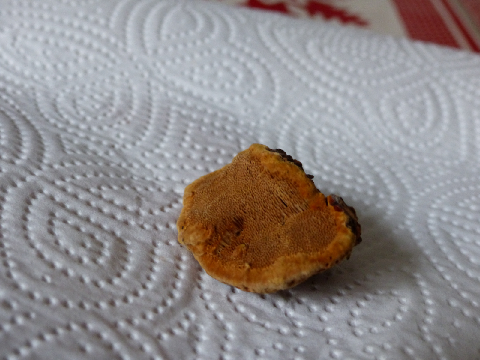 Ist schwer zu erklären, aber auf mich wirkt dein Fund weder wie ein Hapalopilus noch wie ein Pcynoporellus. Eher würde ich bei dem breiten, sterilen Rand und der Porenform an >Gloeophyllum odoratum< denken, aber solche Pilze sind nur über Bilder schwer einschätzbar.