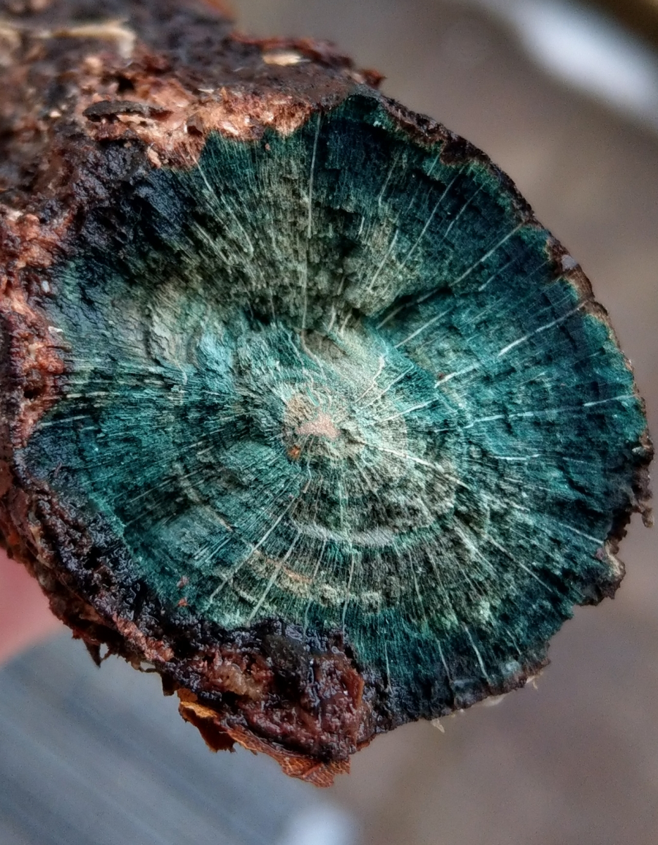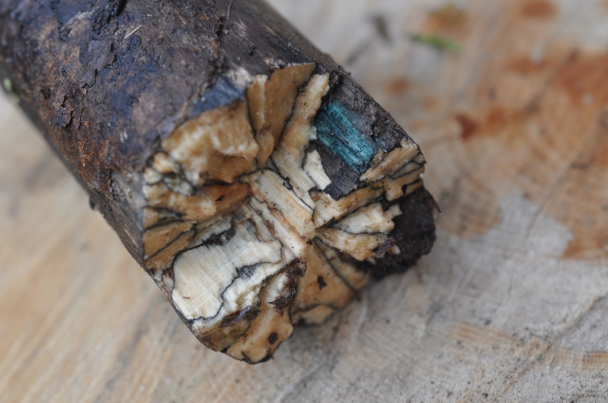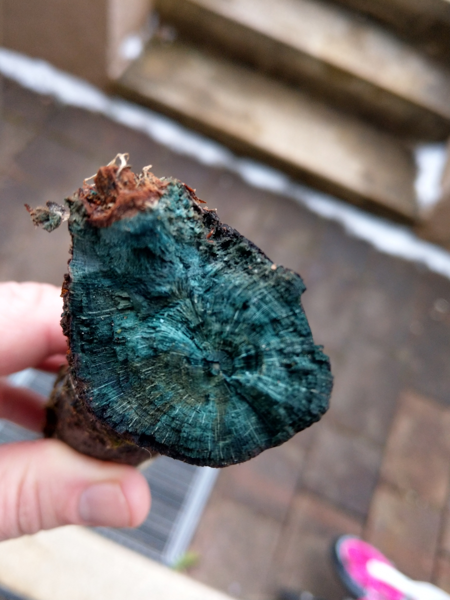 Beachtlich, meistens finde ich nur teilweise grün durchfärbtes Holz, hatte aber noch nie einen Ast in der Hand, der komplett von Mycel durchsetzt war.LG; Pablo.