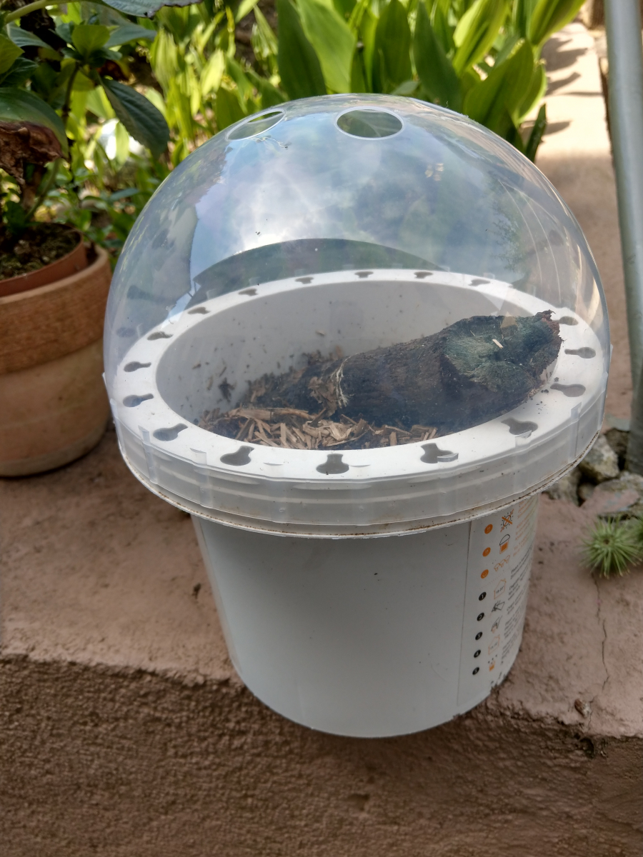 ein update vom Grünspanbecherlingsast, den ich in einen Pilzkultureimer gefüllt mit Hanfstreu und Strohpellets richtig nass im Freien gelagert hatte.