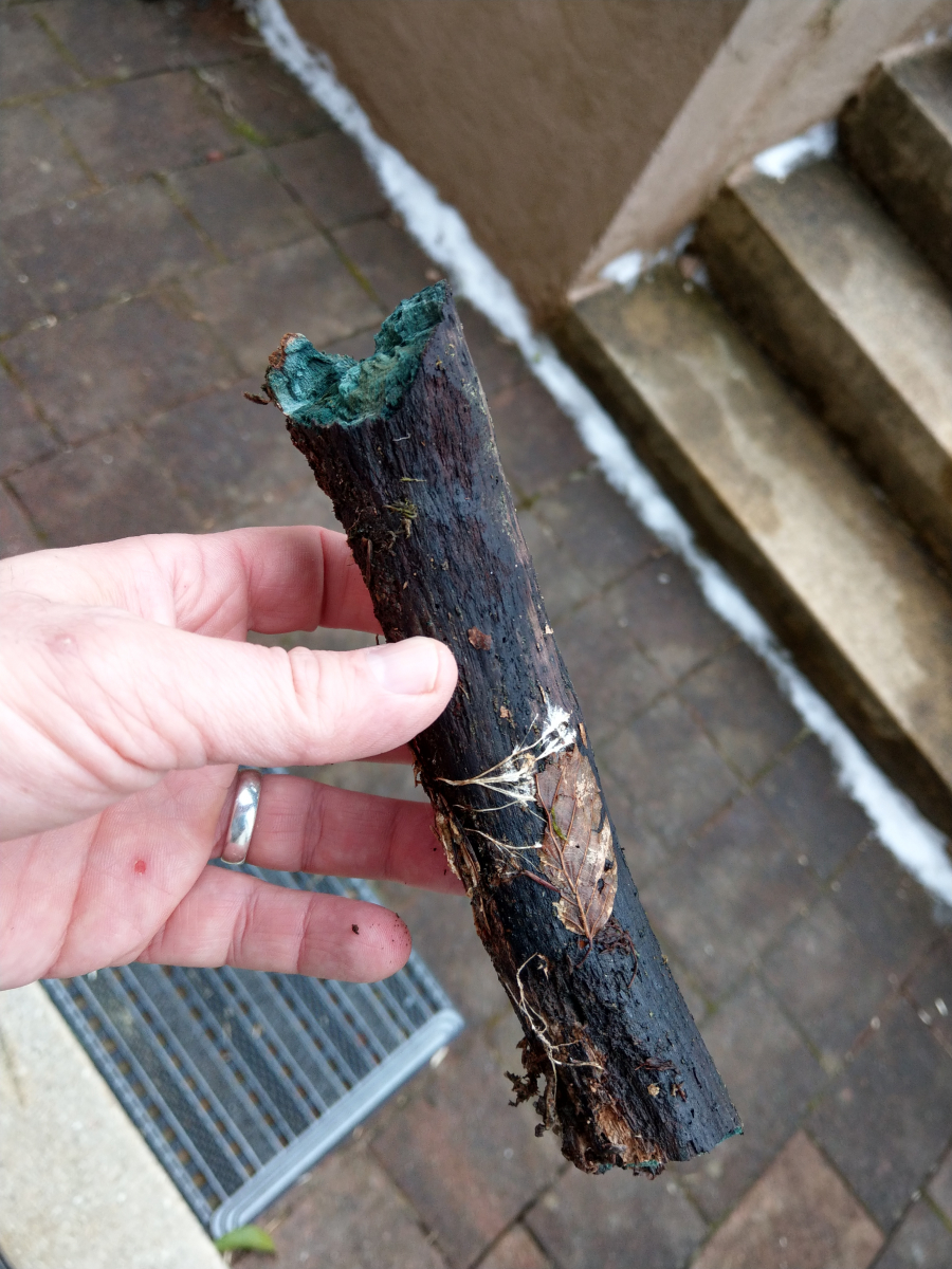 Beachtlich, meistens finde ich nur teilweise grün durchfärbtes Holz, hatte aber noch nie einen Ast in der Hand, der komplett von Mycel durchsetzt war.LG; Pablo.