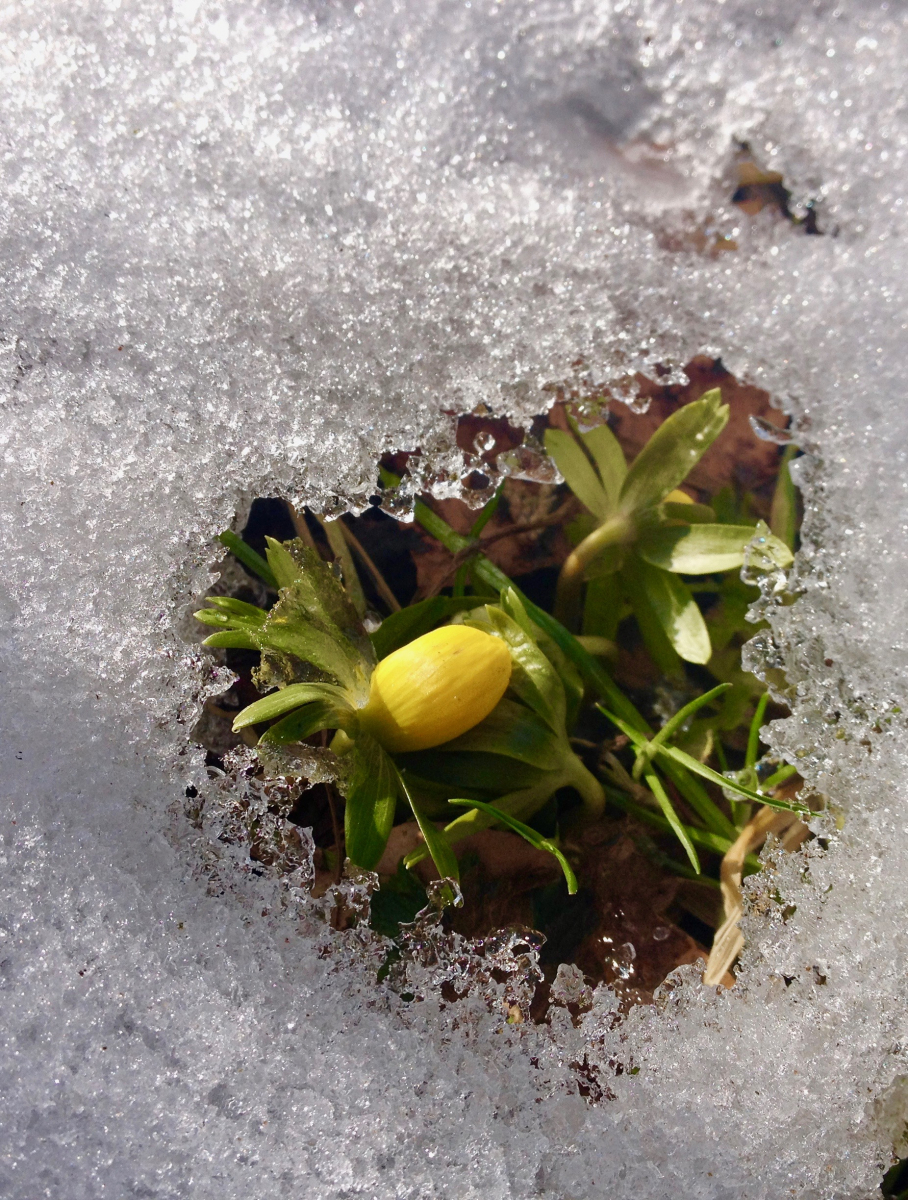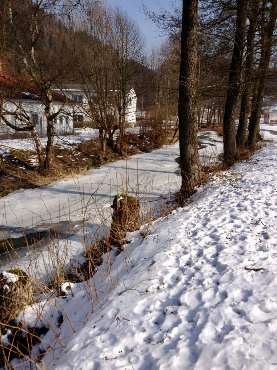 Noch hat die Schwarza einen dicken Eispanzer, aber am Haus grüßen selbst in unserer kalten Ecke die ersten Frühlingsboten.