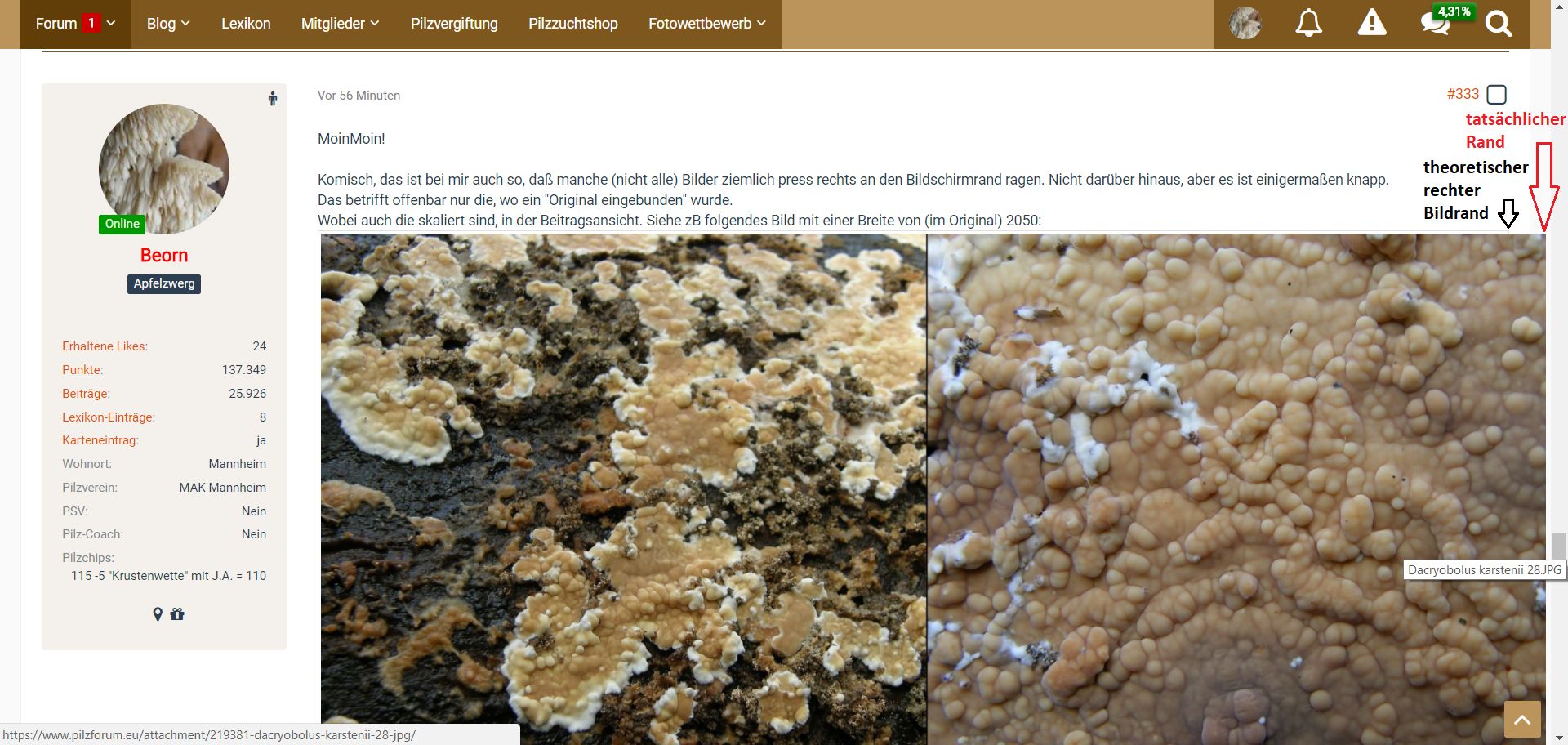 ----Ein Tipp von mir: mit den Browsereinstellungen für die Ansicht spielen. Ich habe nur einen 14-Zöller und der läuft auf 1366x768 (also nicht Full HD oder so). Heutzutage gibt es ja kleine Bildschirme mit extremer Auflösung, da wirken viele Webseiten und auch Bedienelemente sehr klein (mir zu klein). Bei meinem Bildschirm gehe ich bei manchen Seiten auf 110 Prozent-Ansicht und hier im Pilzforum finde ich jetzt bei meinem Gerät 90 Prozent ideal, dann wird alles etwas kleiner und rückt etwas zusammen. Der Browser merkt sich die jeweiligen Einstellungen.