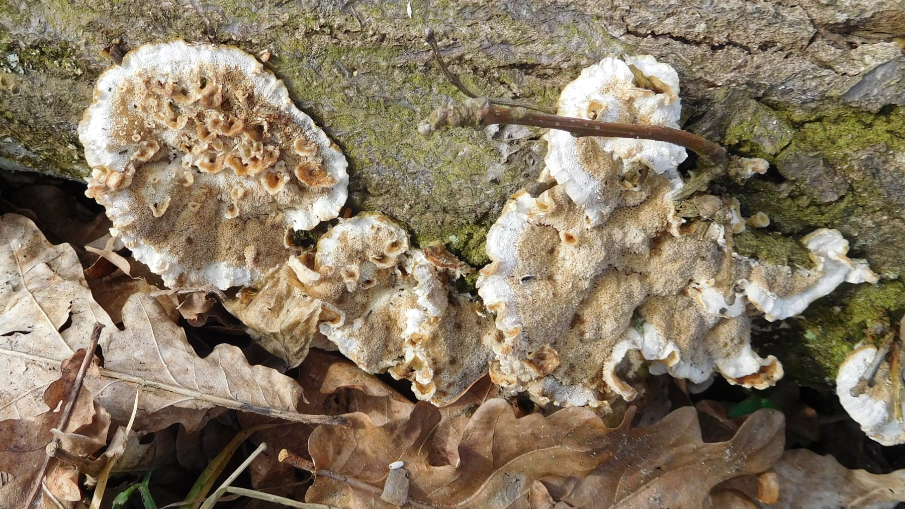 Heute war ich nicht in die Pilze aber man findet doch immer wieder etwas interessantes. Diese Schmetterlingstramete (oder doch Ockertramete?) muß mal unterwüchsig gewesen sein. Einer von den großen Stürmen hat sicherlich den Ast abgebrochen. Daraufhin waren die Trameten nicht mehr unterwüchsig. Es bildeten sich auf der Unterseite viele winzige neue Trameten. Das hatte ich bisher so noch nicht bei den Schmetterlingstrameten (oder Ockertrameten) gesehen.