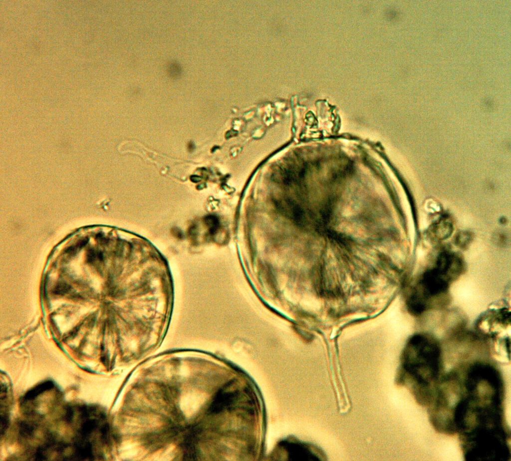 Die Kristalldrusen bei Phallaceae sind schon sehr lange bekannt - es gibt auch historische Zeichungen. Da ich sie mehrfach live gesehen habe, hat mich das Foto hier direkr daran erinnert. Was abernicht klärt, woher die Strukturen waren. Ich hatte daher vermutet, dass da irgendwie eine Phallaceae in der Nähe war. Ich kenne diese Form der intrazellulären, großen Kristalldrusen nur von den Phallaceae.