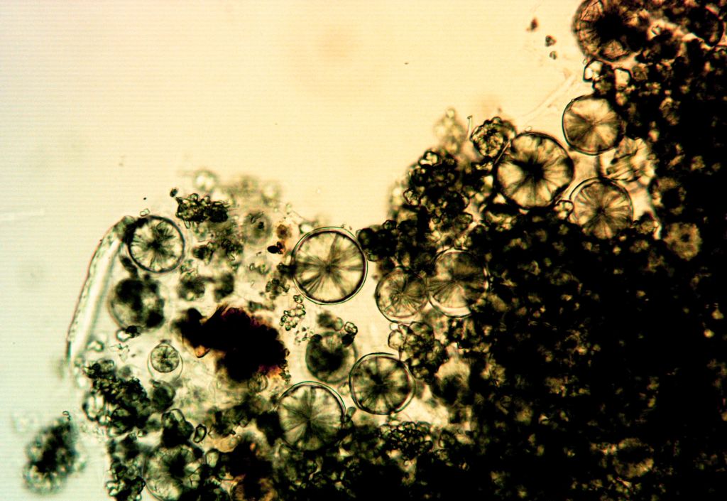 Die Kristalldrusen bei Phallaceae sind schon sehr lange bekannt - es gibt auch historische Zeichungen. Da ich sie mehrfach live gesehen habe, hat mich das Foto hier direkr daran erinnert. Was abernicht klärt, woher die Strukturen waren. Ich hatte daher vermutet, dass da irgendwie eine Phallaceae in der Nähe war. Ich kenne diese Form der intrazellulären, großen Kristalldrusen nur von den Phallaceae.