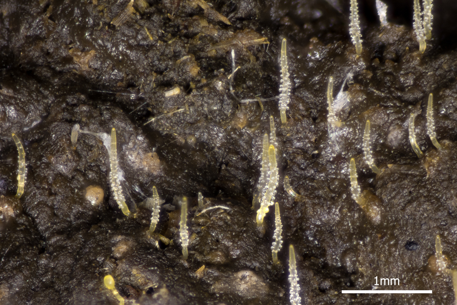 Heute waren plötzlich diese Teile da, die ich nicht einmal grob einem Taxon zuordnen kann. Sie scheinen gelben, gallertigen "Brutkörpern" zu entspringen, die -wenn ich mich nicht irre- schon initial in den Kötteln sichtbar waren.