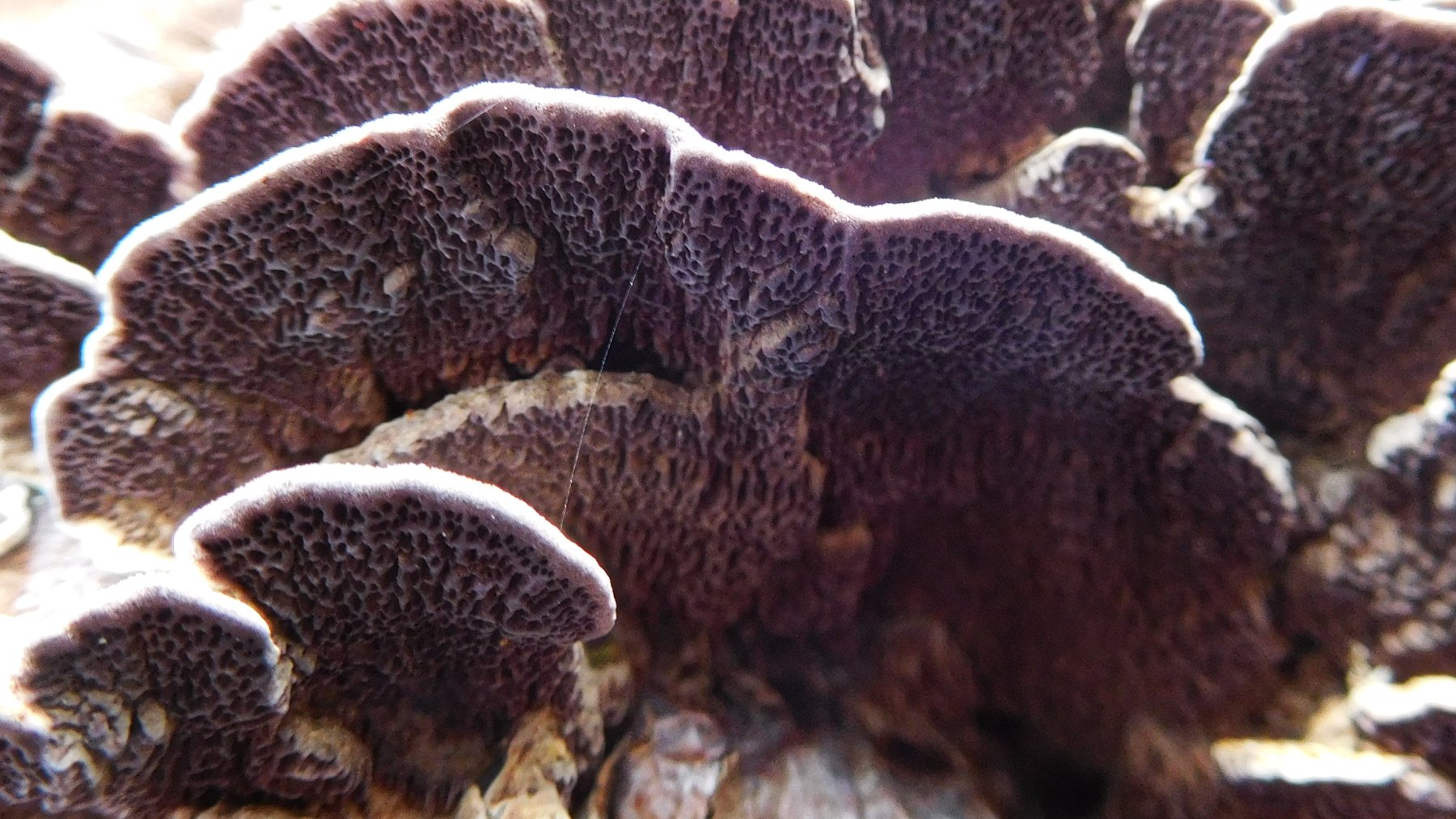 Auf einer (fast) abgestorbenen Kiefer wuchsen tausende winzige Fruchtkörper vom Lederporling. Ich vermute eher den Zahnförmigen Lederporling (Trichaptum hollii). Aber ganz sicher bin ich nicht, ob der Gemeine Violettporling (Trichaptum abietinum) solche eigenwilligen Poren ausbilden kann.