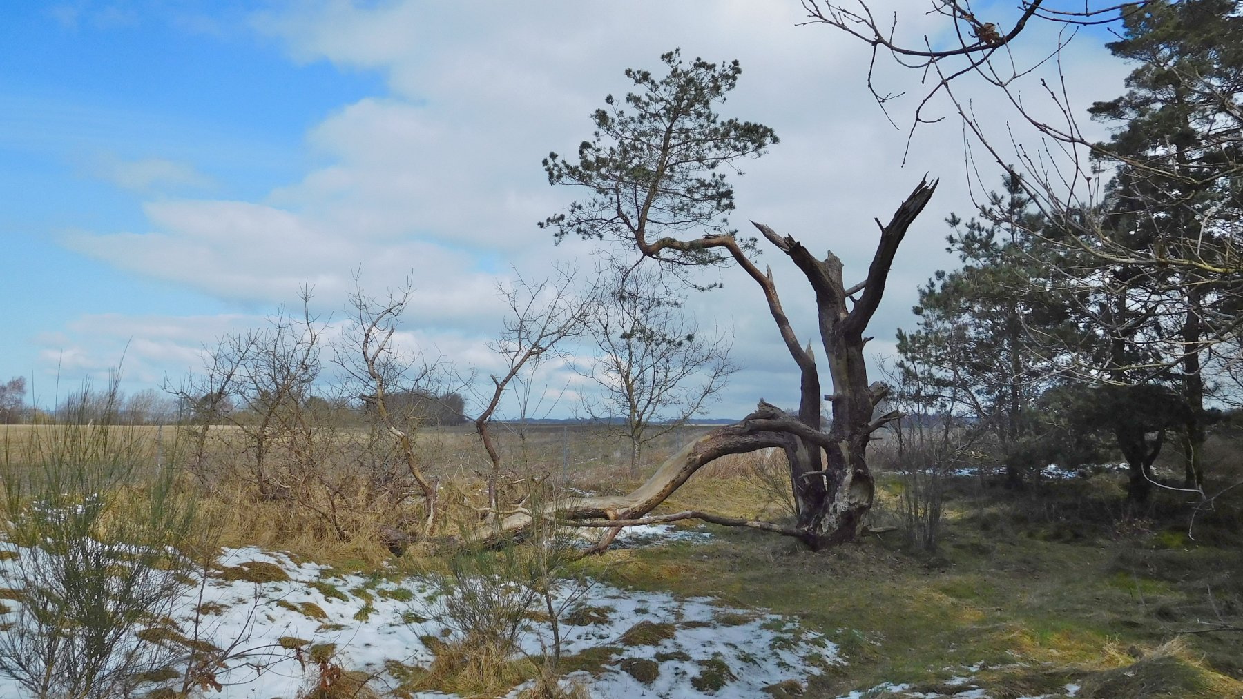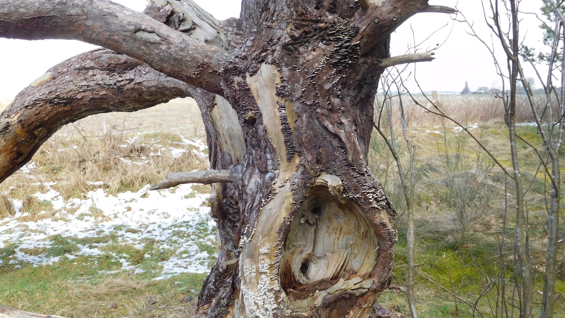 Auf einer (fast) abgestorbenen Kiefer wuchsen tausende winzige Fruchtkörper vom Lederporling. Ich vermute eher den Zahnförmigen Lederporling (Trichaptum hollii). Aber ganz sicher bin ich nicht, ob der Gemeine Violettporling (Trichaptum abietinum) solche eigenwilligen Poren ausbilden kann.