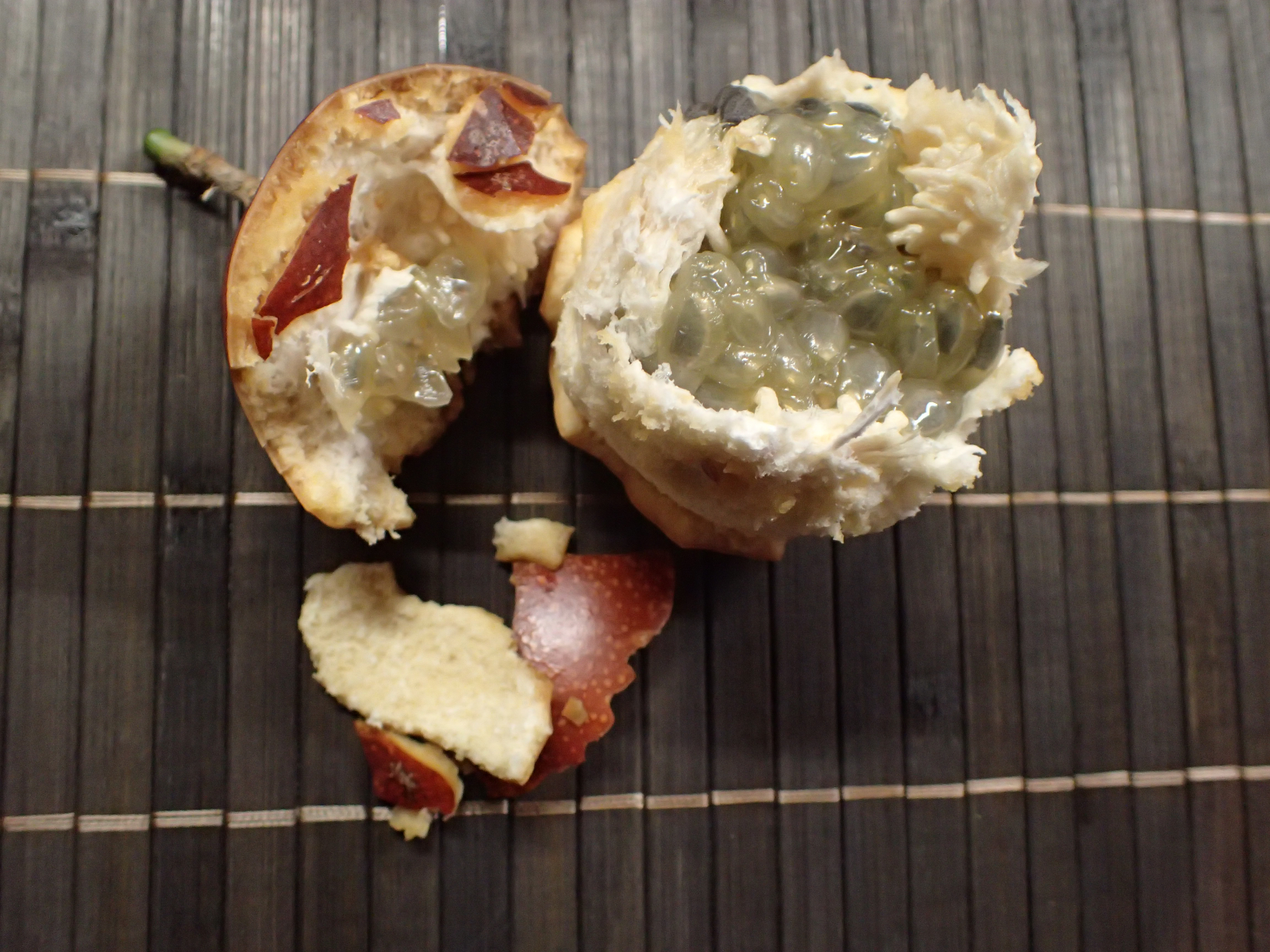 Den gesamten Inhalt, auch die weiße äußere Schicht kann man essen, isst man dann Bissen für Bissen. Die Kerne sind appetitlich und leicht zu kauen.
