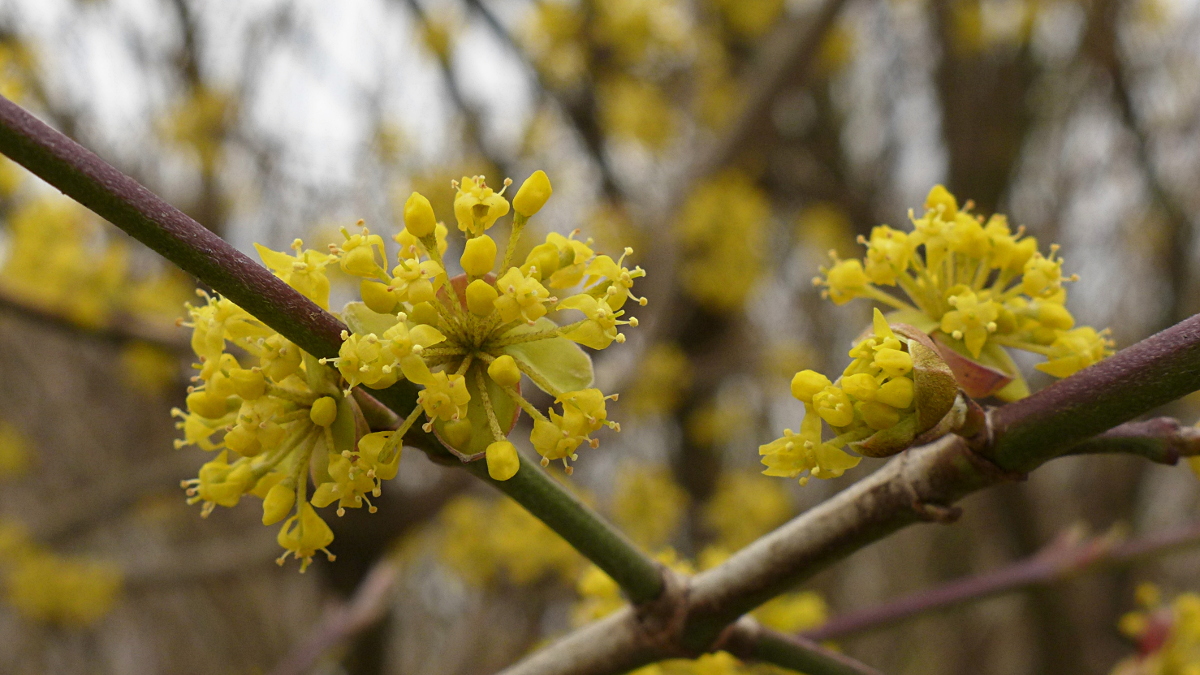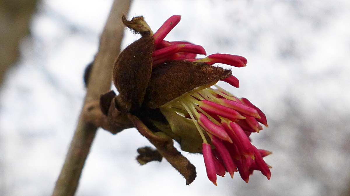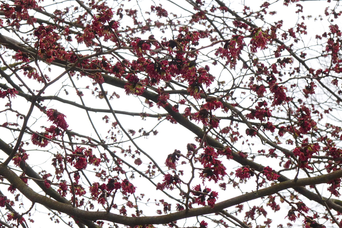 Blüten von Parrotia persica, Eisenholzbaum auf dem Friedhof (nach erfolglosem Rindenmulch-Scan)