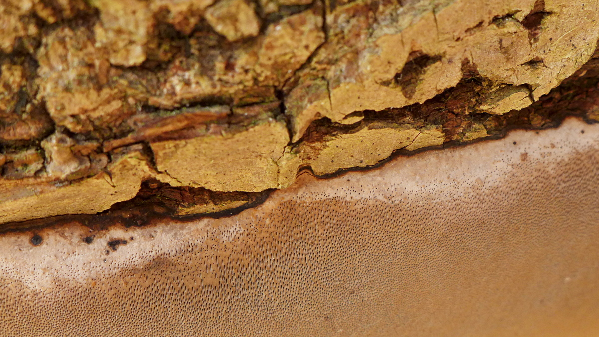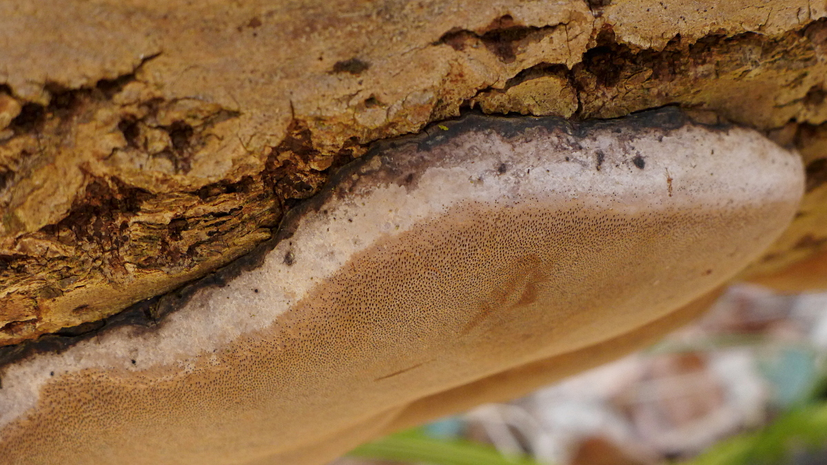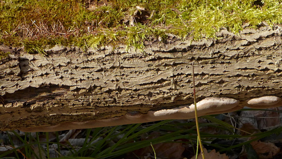 Phellinus cf. trivialis, ein Feuerschwamm an freischwebend liegendem Weidentotholz auf der Unterseite (der Stamm liegt schon lange da, bisher hatte ich da keinen Porling gesehen)