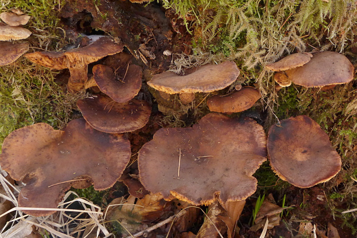 Neolentinus adhaerens, Klebriger Sägeblättling, ein ganze Menge an der Schnittkante von liegendem Nadeltotholz. Den fand ich in der Ecke schon öfter, hier allerdings hatte mich eine im Sonnenlicht sehr deutlich erscheinende gelbliche Verfärbung der Lamellen verwundert, das hatte ich so noch nie gesehen.