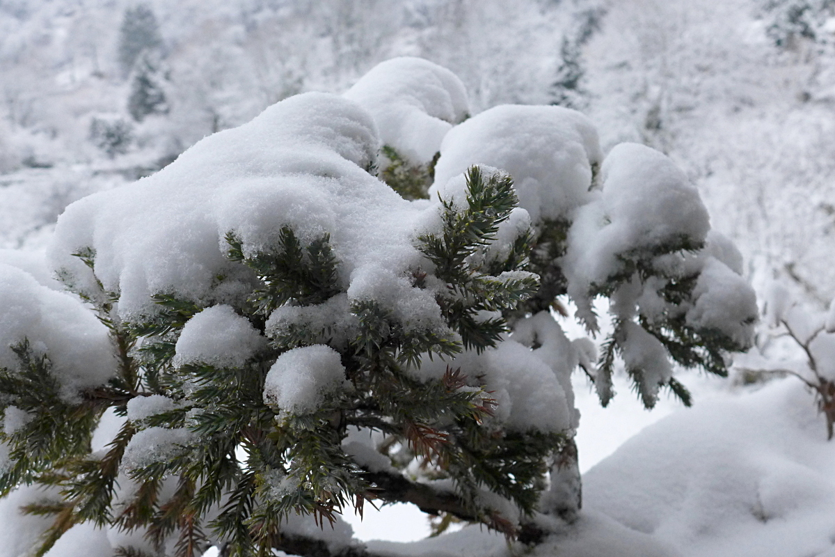 Mein eingeschneites Balkonkasten-Biotop mit meinem Juniperus squamata, Beschuppter Wacholder (schon einige Jährchen alt)