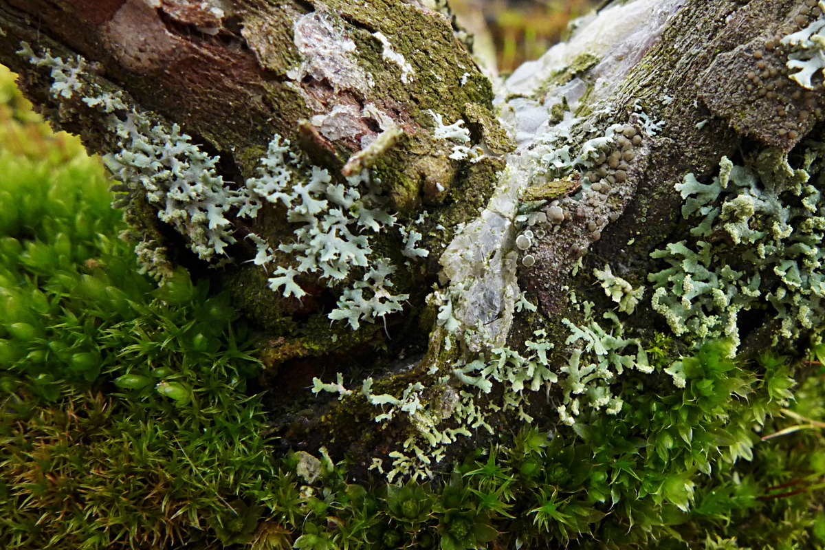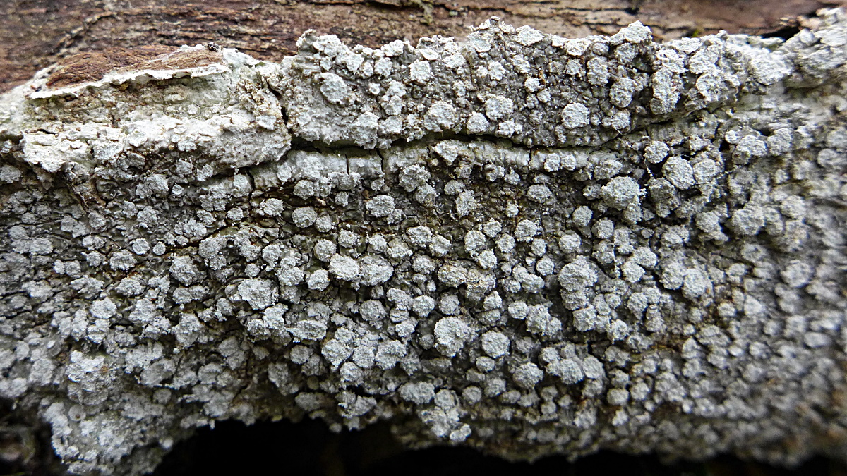 Noch eine Flechte, an einem liegenden losen dicken Laubholzast (wahrscheinlich aus größerer Höhen von einem lebenden Baum abgebrochen), Pertusaria spec., Porenflechte (P. cf. amara oder albescens - schon wieder habe ich vergessen zu probieren, ob die Flechte bitter schmeckt. Allerdings gibt es keinen abgesetzten zonierten Randbereich, was für P. amara spricht).