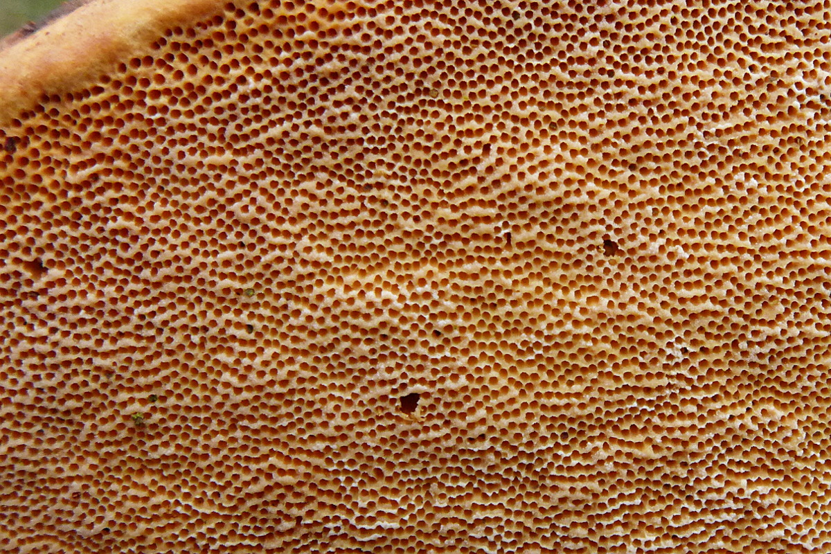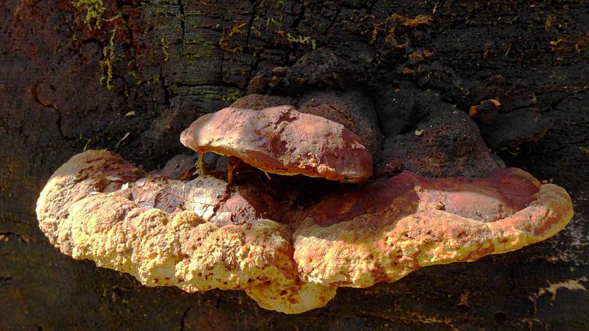 Auffällig - und das hatte ich schon mal im März, und nur im März - , dass die Unterseite von einem Rotrandigen Baumschwamm, Fomitopsis pinicola (an liegendem Kirschentotholz) so eine leuchtende Farbe bekommen hat, als hätte das Rot dahin abgefärbt (so eine schöne apricot-orange Farbe)