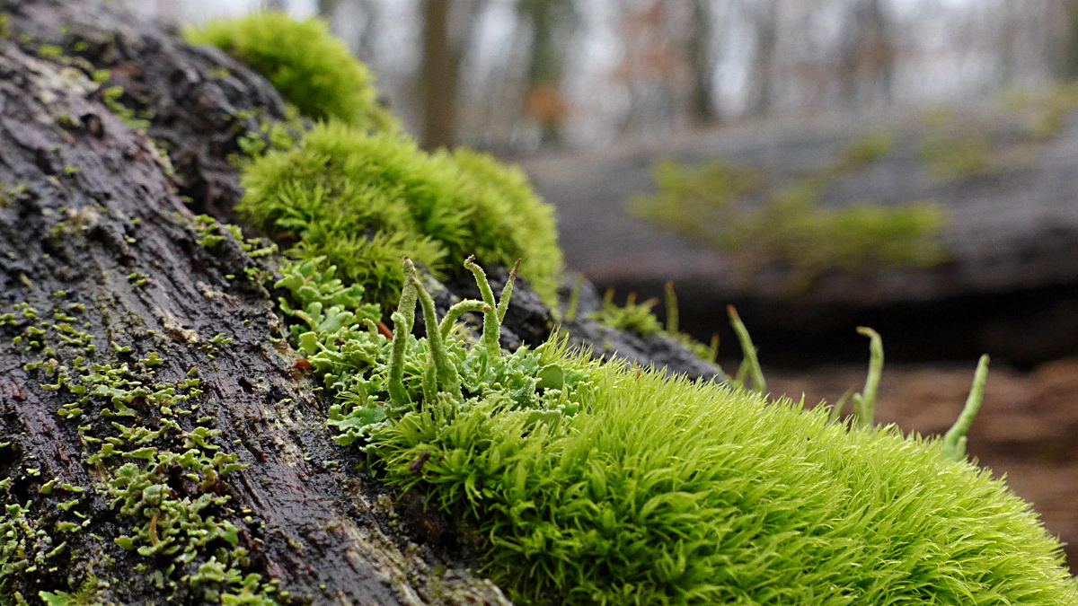 hübsche Cladonien mit hübschem Moos (cf. Dicranum spec., Gabelzahnmoos)