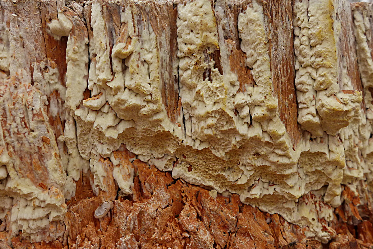 Nach langer Zeit mal wieder frischer Zuwachs von Antrodia xantha (Gelbliche Resupinattramete) an einem Nadelholzstumpf.