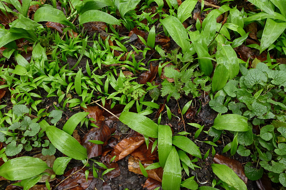 Im "Hauptbärlauchgebiet": ahaaaaa!!! Großer Bärlauch und kleiner Bärlauch, Allium ursinum ... und auch schon Knoblauchrauke, Allliaria petiolata und Brennnesseln (winzig).