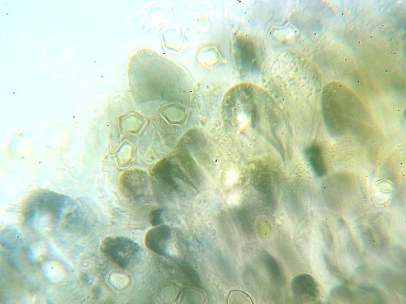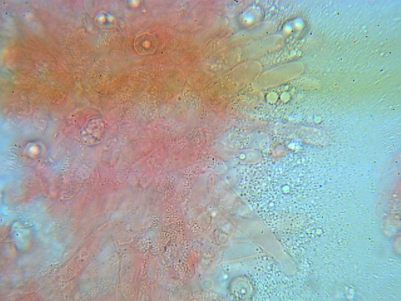 Ich habe noch ein Bild gefunden, auf dem es überdeutlich wird. Die gesamte Lamellenschneide ist von Körnchen umgeben, die durch Quetschen des Präparates freigesetzt wurden. Total ätzend, wenn man dann noch auf 2-sporige Basidien oder Schnallen achten muss