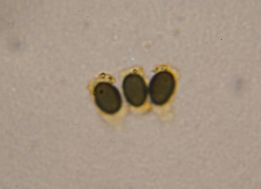 Die Sporen von C. leucoplaca sind typisch linsenförmig, also deutlich abgeplattet (wie bei vagans oder scatigena).