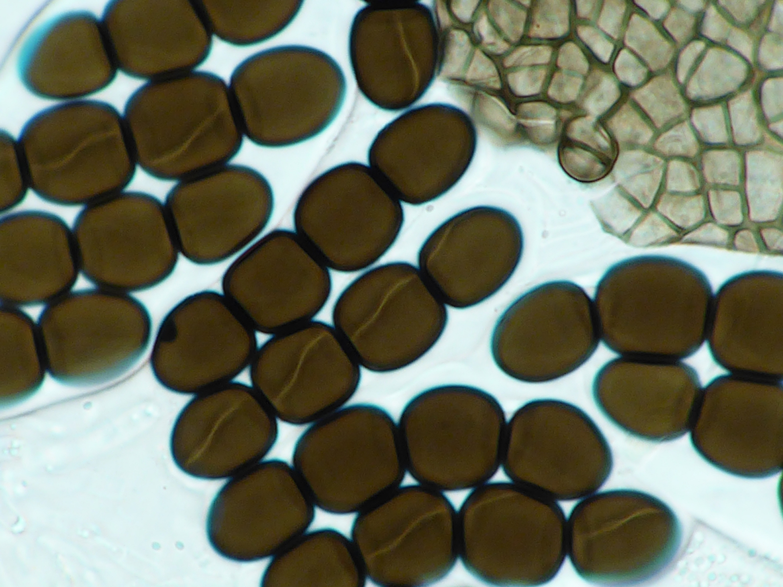 Leider waren in dem Perithecium nur drei Asci, die schon aufgelöst waren. Vermutlich? kurzstielig. Sie Sporen messen 50,0-51,5 x 11,9-13,5 µm. Die fast kugeligen Zellen werfen mich aus der Bahn.