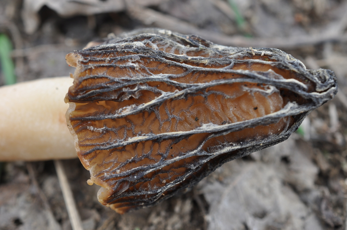 Ja, sieht so aus als wären auch diese älteren Exemplare mit den schmalen Rippen Böhmische Verpeln: Weil ja Hut und Stiel nur ganz oben an der Stielspitze verwachsen, nicht ungefähr auf halber Höhe des Hutes, wie bei Käffchenmorchel (Morchella semilibera). ![]()