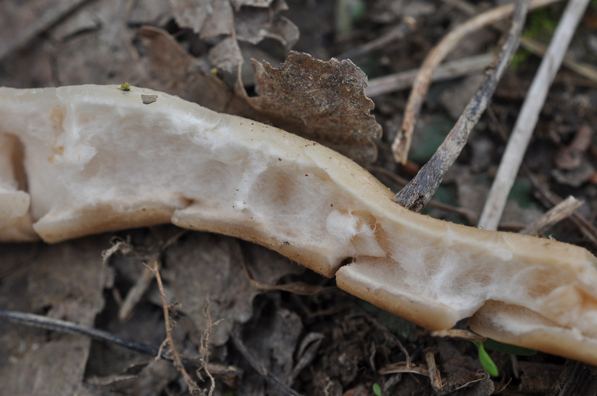 Die Käppchenmorchel ist auch an der Stielspitze oft etwas gefurcht. Hier ist die Stielspitze glatt.