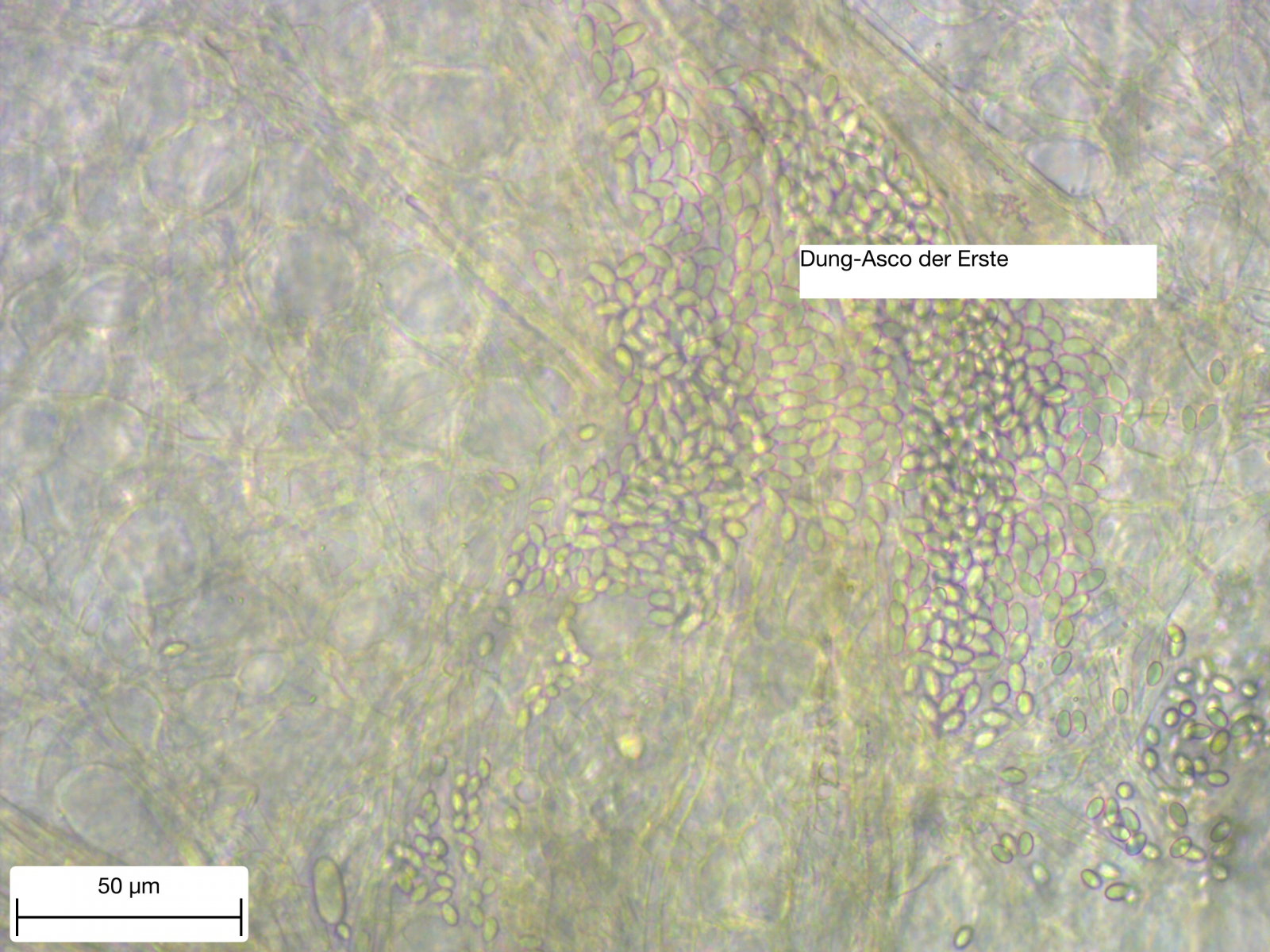 Die vielen kleinen Sporen können Schimmelpilzsporen sein, können aber auch Ascosporen von einem vielsporigen Ascus sein. Es gibt da einige Gattungen, die so was können.