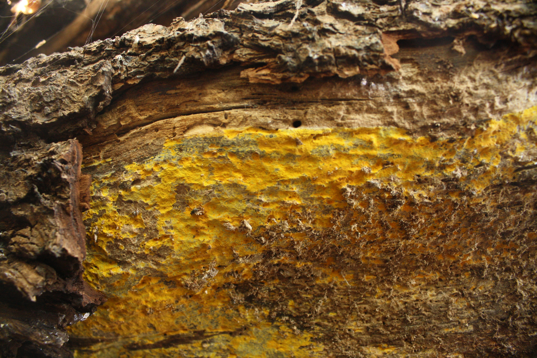 Ich bin nach wie vor überzeugt, daß du hier Phlebia subochracea zeigst (Sporen sind vielleicht noch nicht ganz ausgewachsen), weil von anderen Pilzen mit phlebioidem Fruchtkörperaufbau (dichte Subyhmeniale Hyphenstrukturen, Schnallen, schmal keulige Basidien usw.) hast du mit so einer krassen Färbung eigentlich kaum noch Optionen, außer zB Crustoderma dryinum (mit ganz anderen Zystiden).